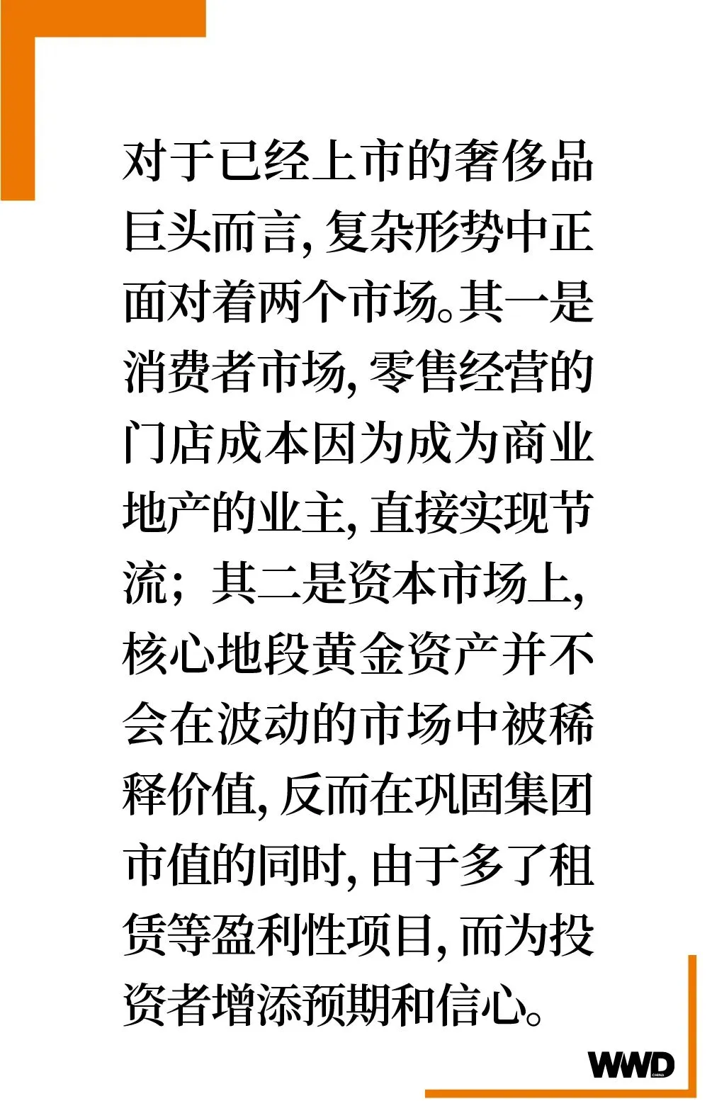 对于已经上市的奢侈品巨头而言,复杂形势中正面对着两个市场。其一是消费者市场,零售经营的门店成本因为成为商业地产的业主,直接实现节流;其二是资本市场上,核心地段黄金资产并不会在波动的市场中被稀释价值,反而在巩固集团市值的同时,由于多了租赁等盈利性项目,而为投资者增添预期和信心。不得不说,连奢侈品这样的“老钱”代表都在用资产配置验证了一个市场共识——核心地带的楼宇,稀缺决定价值,最终成为企业穿越周期过程中最为安全的理财方式。