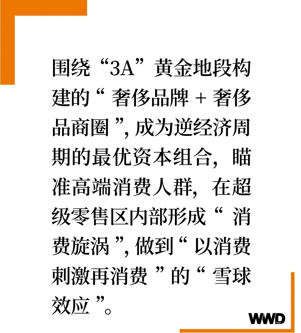 如今,围绕“3A”黄金地段构建的“奢侈品牌+奢侈品商圈”,成为逆经济周期的最优资本组合,瞄准高端消费人群,在超级零售区内部形成“消费旋涡”,做到“以消费刺激再消费”的“雪球效应”。