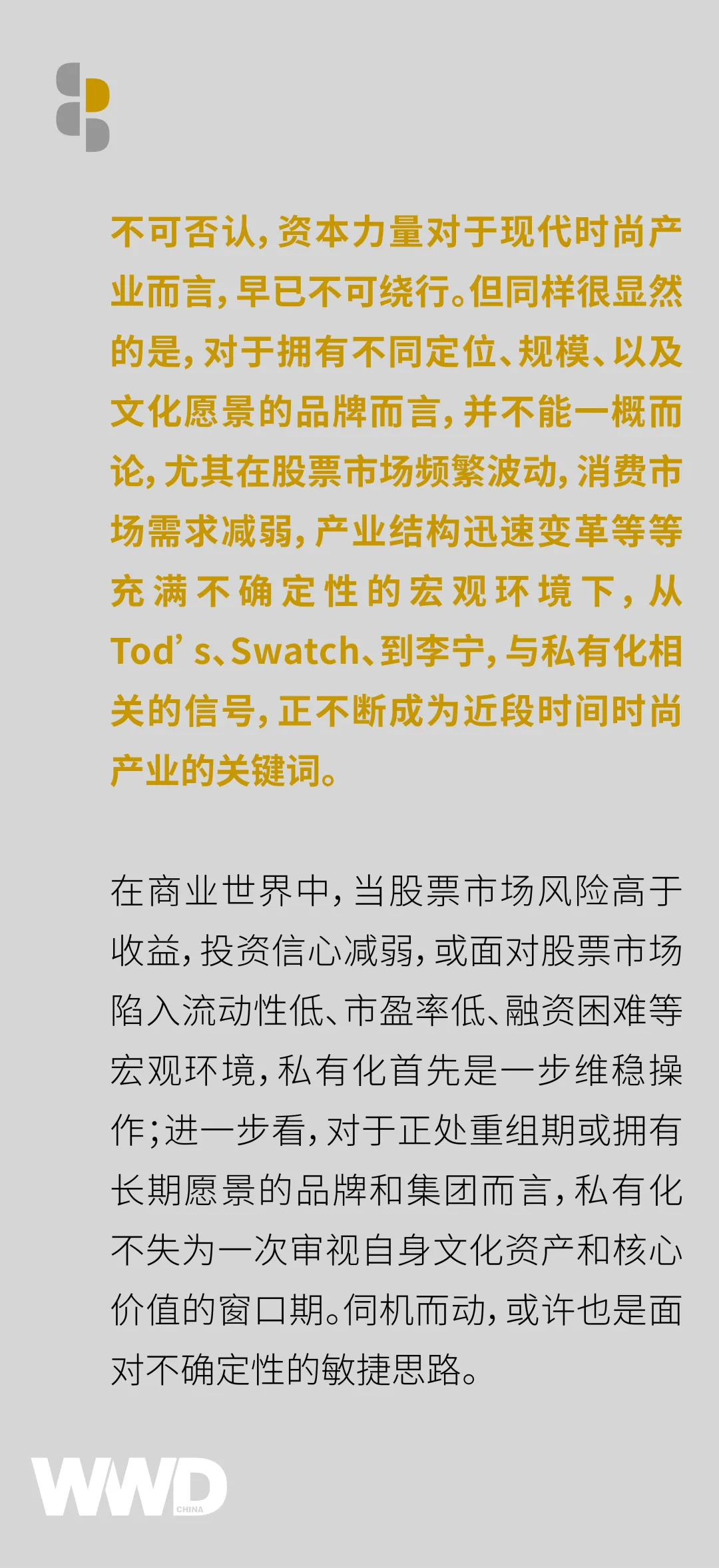 相比于在股票市场上由投资者信心牵引其品牌商业布局和设计创新,一切以资本市场满意的财务报表为导向,硬币的另一面,对于正处积极重组的品牌或集团而言,私有化也为其获得了充足的话语权和窗口期,通过对品牌文化资产和商业价值的多重思考,寻找更具稀缺性和长期价值的发展路径。