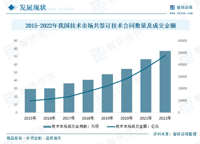 2021年,我国共登记技术合同67.1项,同比增长22.1%;成交金额37294.3亿元,同比增长32%;2022年,我国共登记技术合同77.25项,同比增长15.13%;成交金额37294.3亿元,同比增长28.15%,全国技术合同认定登记成交金额居前十位的省市依次为北京、广东、上海、江苏、山东、陕西、湖北、安徽、浙江和湖南。