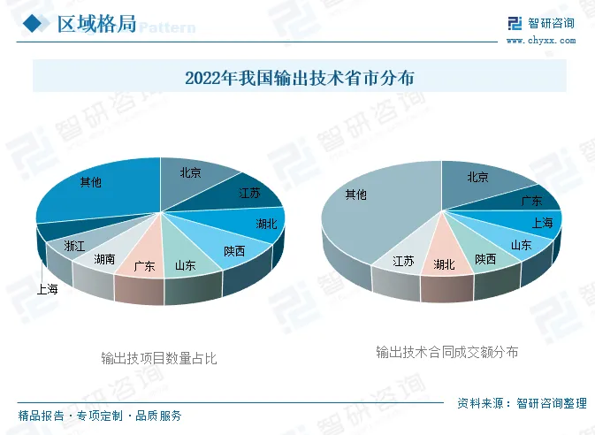科技服务业是现代服务业的重要组成部分,具有人才智力密集、科技含量高、产业附加值大、辐射带动作用强等特点。从全球范围来看,世界科技服务业最为集聚的地区均是经济发展环境优良和高新技术创新创业活动十分活跃的区域,且科技服务业发展与区域经济增长形成了真正发良性互动机制。2022年,我国输出技术772507项,其中北京占12.31%;江苏占11.22%;湖北占9.97%;陕西占8.87%;山东占7.18%。输出技术合同成交额47791.02亿元,其中北京占16.63%;广东占8.30%;上海占8.12%。