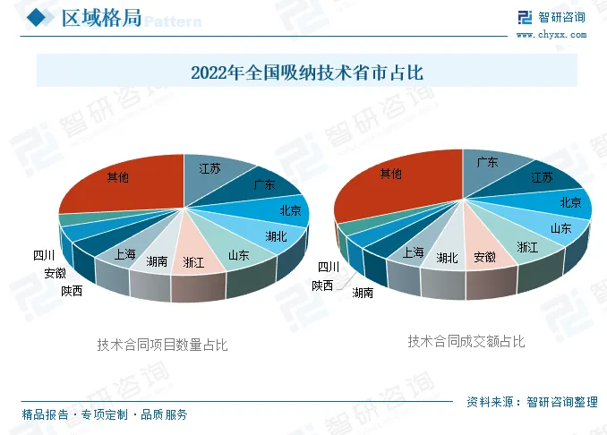 从全国各省吸纳技术占比来看,江苏技术合同项目数量占11.04%;广东技术合同项目数量占10.20%;北京技术合同项目数量占9.01%,依次排名全国前三。技术合同成交额占比排名前三的分别为广东、江苏、北京,占比分别为11.20%、10.72%、8.61%。