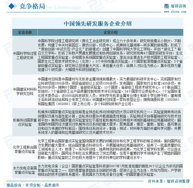 近些年我国生产技术管理咨询服务、法律支持服务、与计算机相关联的服务和工程设计服务等各领域科技服务业的发展都直接或间接为企业发展创造了良好的条件。目前,我国领先研发服务企业有中国科学院过程工程研究所、中国建筑材料科学研究总院、机械传动国家重点实验室、化学工程联合国家重点实验室、水力发电设备国家重点实验室等。