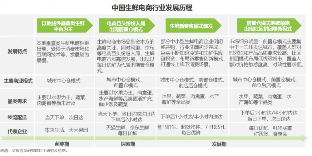 历经探索、高速发展、洗牌,进入后成长期转型升级阶段根据公开的资料,最早的生鲜电商平台(易果生鲜)创建于2005年,但这一业态集中爆发还是在2015、2016、2017年三年。2018年新创建的生鲜电商品牌数量较往年有明显减少,这也说明生鲜电商开始从狂热走向理智,从激进走向审慎。生鲜电商从无到有,从不被关注到成为“风口”,可根据发展特点等归纳为四个阶段:以地域性垂直类生鲜平台为主的萌芽期,主要以城市中心仓模式为主,受限于消费市场和互联网技术等,配送速度为当日下单次日达,代表企业有本来生活、天天果园。