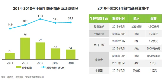 生鲜电商一直备受资本市场关注,近两年来发展日趋理性,融资事件相对较少,但融资金额较大,资本向头部企业集中的特点愈发明显。从融资情况看,2018年全年共有融资事件37起,融资金融57.7亿元。每日优鲜和生鲜传奇为首的两大生鲜电商继续引领融资,每日优鲜完成4.5亿美金的战略融资,资金将主要用于上游供应链开发、全国冷链物流基础设施建设、智慧零售技术的战略投入;生鲜传奇则完成3亿美金D轮融资,资金将用于门店的扩展和供应链建设。