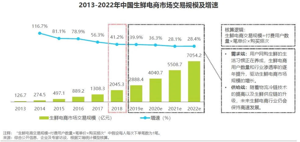 按照销售品类,还可将生鲜电商平台划分为综合类和垂直类电商。两种模式各有优劣,综合电商模式有其规模经营、高市场份额和品牌效应带来的先发优势,并且有其他品类做支撑,导流较为容易。垂直生鲜电商专注做领域更关注细分领域,对供应链的把控能力较强,配送效率较高,消费体验相对较好。综合类生鲜电商代表企业:天猫生鲜、盒马鲜生、超级物种、朴朴超市 等垂直类生鲜电商代表企业:每日优鲜、叮咚买菜、谊品生鲜 等2018年生鲜电商市场的增速达41.2%,交易规模突破2000亿元。虽历经2016年-2017年的洗牌期,大量小中型生鲜电商或倒闭或被并购,但巨头们的入局,供应链和物料等基础建设有了极大的提升,生鲜市场更受关注。