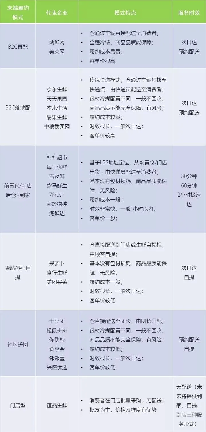 作为复购率高、市场空间巨大的品类,生鲜市场的庞大规模吸引了众多玩家投身其中,作为渗透率低、市场潜力巨大的生鲜电商行业竞争更为激烈。现阶段在生鲜电商这条赛道上除传统外前置仓、 “超市 +餐饮 ”、社区拼团等创新模式不断涌现,割据一方。从目前的格局来看,还没有模式能够真正“称霸”生鲜电商市场。按末端履约模式,我们可以将生鲜电商分为以下四种模式: