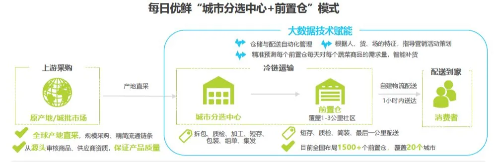从每日优鲜最新一轮融资资金的用途(主要用于上游供应链开发、全国冷链物流基础设施建设、智慧零售技术的战略投入)来看,每日优鲜的模式更像是“重资产”+“劳动密集型”+互联网。前店后仓+到家模式:盒马鲜生