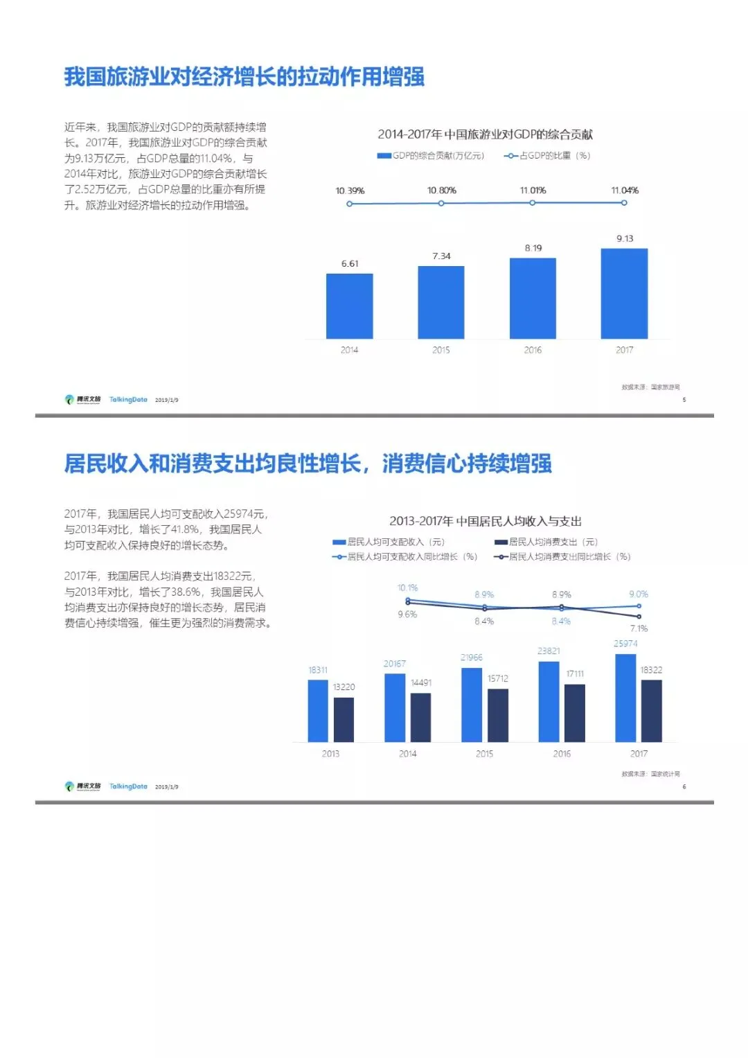 2017年,我国旅游业对GDP的综合贡献为9.13万亿元,占GDP总量的11.04%。一方面,近年来旅游相关政策不断完善,推动旅游行业持续健康发展。另一方面,居民收入和消费支出均良性增长,消费结构升级,品质消费不断提升也促进了旅游产业的繁荣发展。