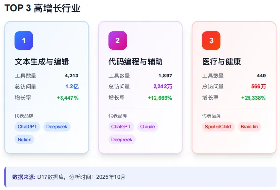 AI工具市场中,文本生成与编辑、代码编程与辅助、医疗与健康三大赛道增长最为强劲,成为行业增长引擎,其背后的技术突破与需求爆发值得深入探究。