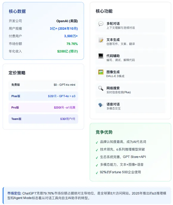 ChatGPT已成为AI领域代名词,占据绝对主导地位。核心数据显示,截至2024年10月,其用户规模突破3亿,付费用户超3500万,市场份额达79.76%,预计年化收入200亿美元,商业价值凸显。