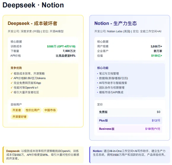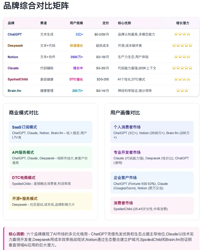 从用户规模、定价、核心优势、增长潜力四个维度,可清晰洞察六大品牌的差异化竞争格局。用户规模上,ChatGPT(3亿+)遥遥领先,Notion(3500万+)紧随其后;Deepseek、Claude等则在细分群体中拥有高忠诚度。