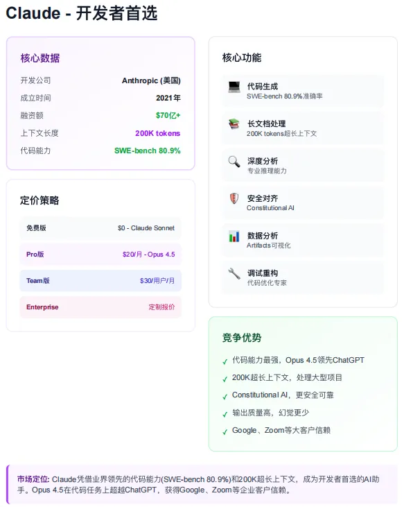 核心竞争力体现在代码能力与上下文处理:SWE-bench测试准确率80.9%,200K tokens超长上下文可轻松应对大型项目,精准完成代码生成、调试重构、深度分析等任务;Opus 4.5模型在代码任务上超越ChatGPT,获得广泛认可。加之Constitutional AI技术保障内容安全可靠,赢得Google、Zoom等大客户信赖,未来将持续深耕开发者服务,巩固赛道领先地位。