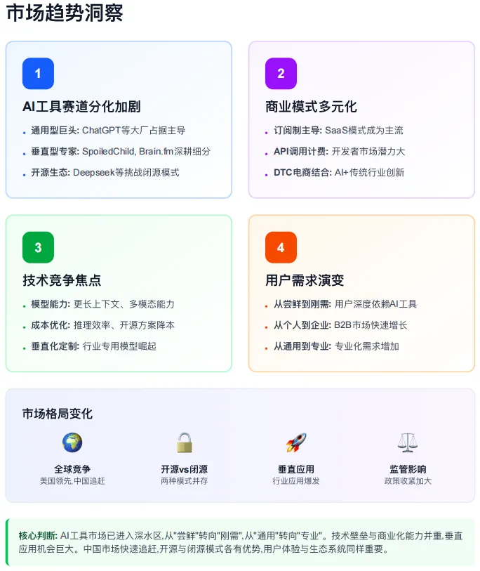 未来,AI工具市场将呈现五大核心趋势,驱动行业持续升级。一是赛道分化加剧:通用型巨头(如ChatGPT)掌控广谱市场,垂直型玩家(如SpoiledChild)深耕细分领域,开源生态(如Deepseek)持续冲击闭源模式。二是商业模式多元化:订阅制为主流,API调用、AI+传统行业融合(如DTC)等新模式不断涌现。