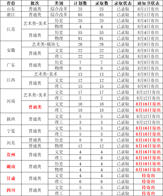 我校各省各批次录取结果如下