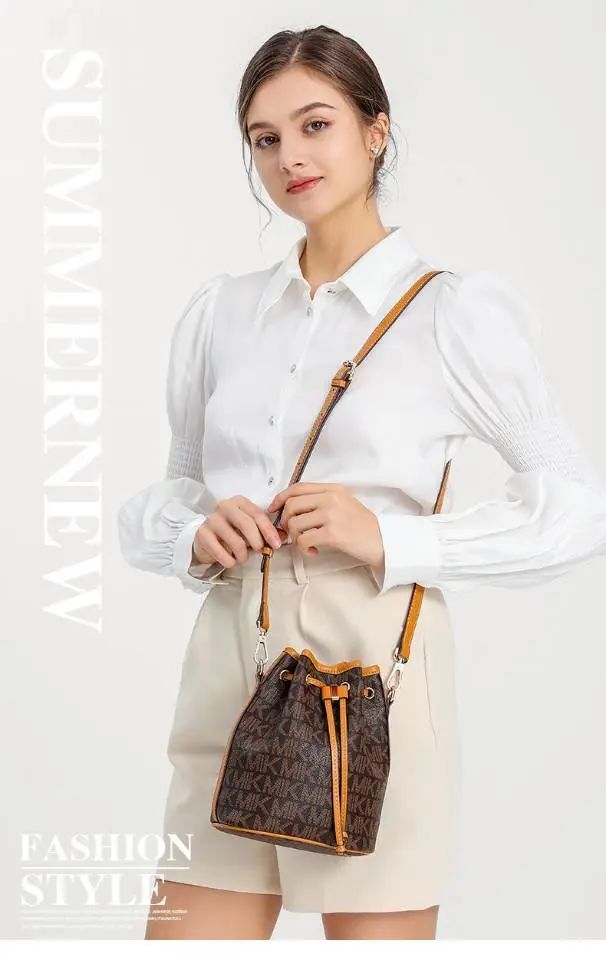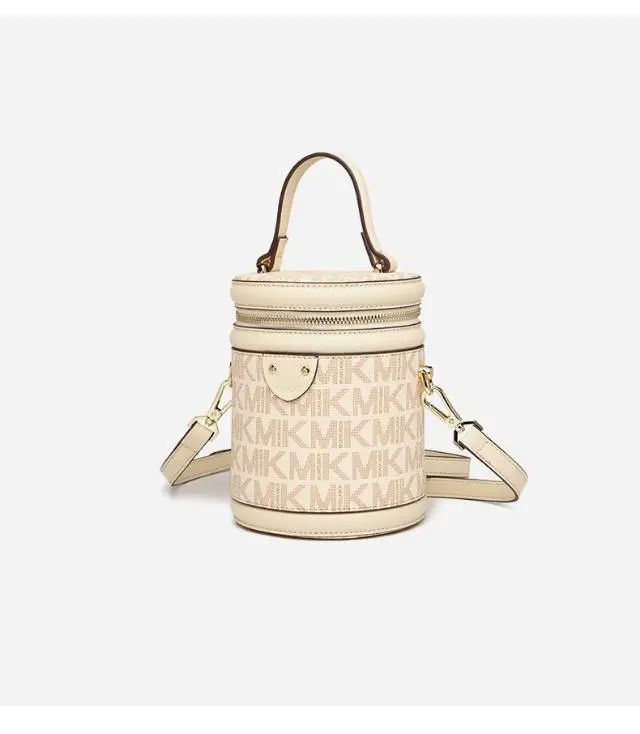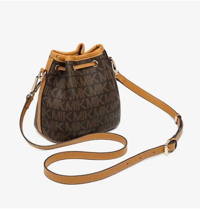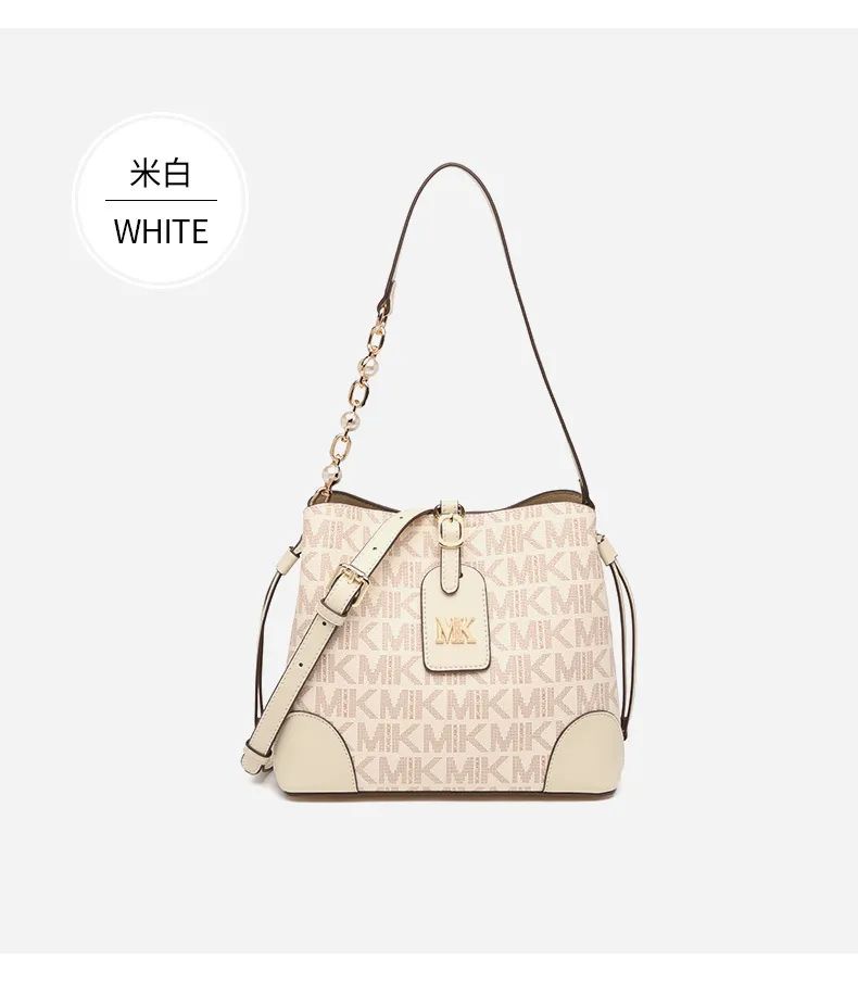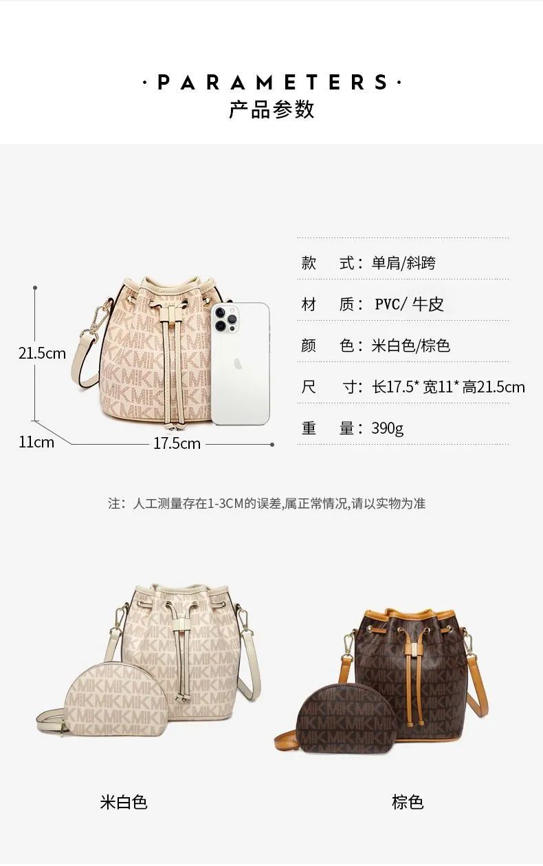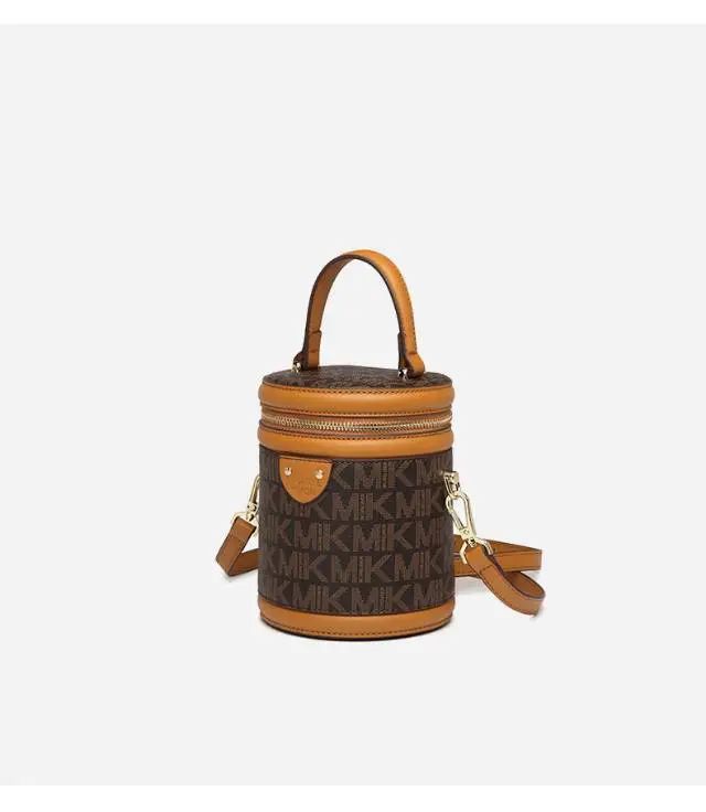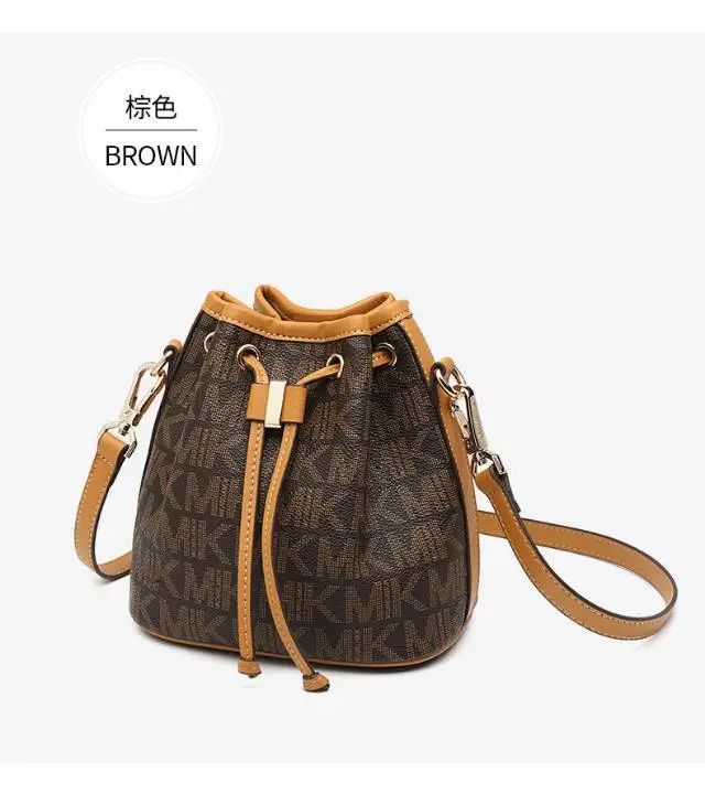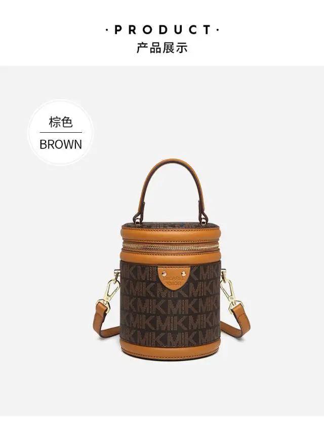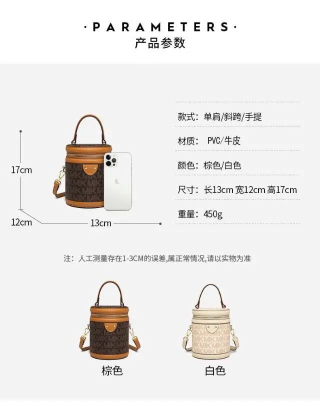 推品25 【品牌】:MICAREL KMOR(英国MK) 【货号】:MK8322-B (新) 【品名】:单肩新款水桶包 【颜色】:棕色/米色 【材质】:PVC/牛皮 【尺寸】:13*12*17 【风格】:极简,复古 【款式】:单肩包/斜跨