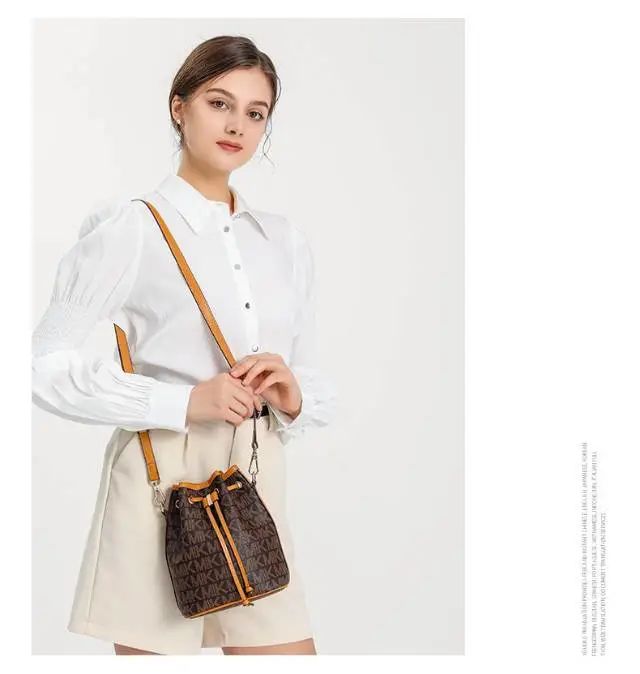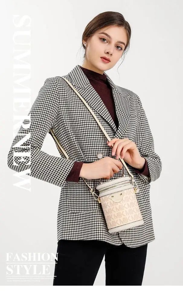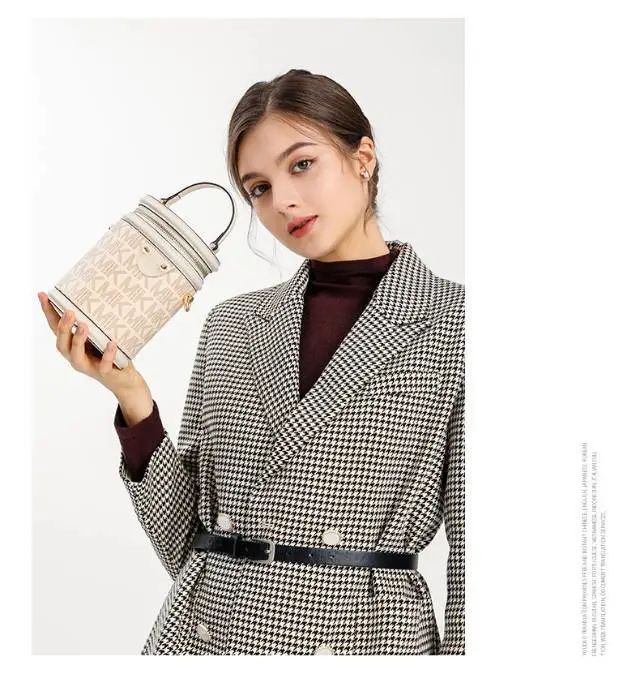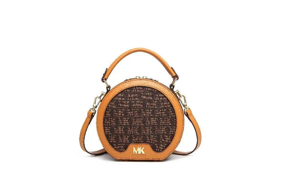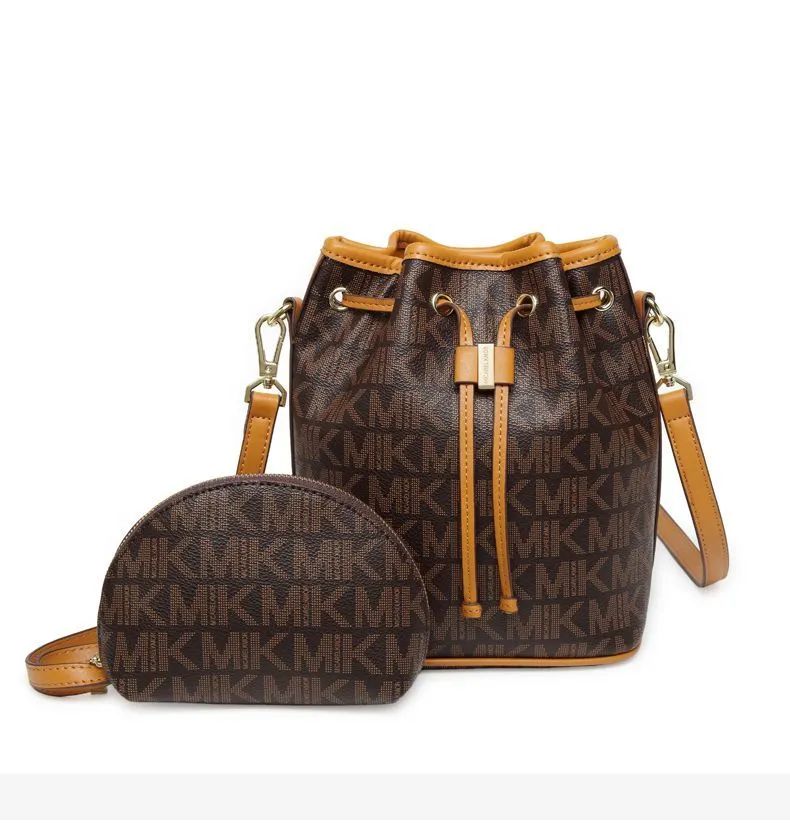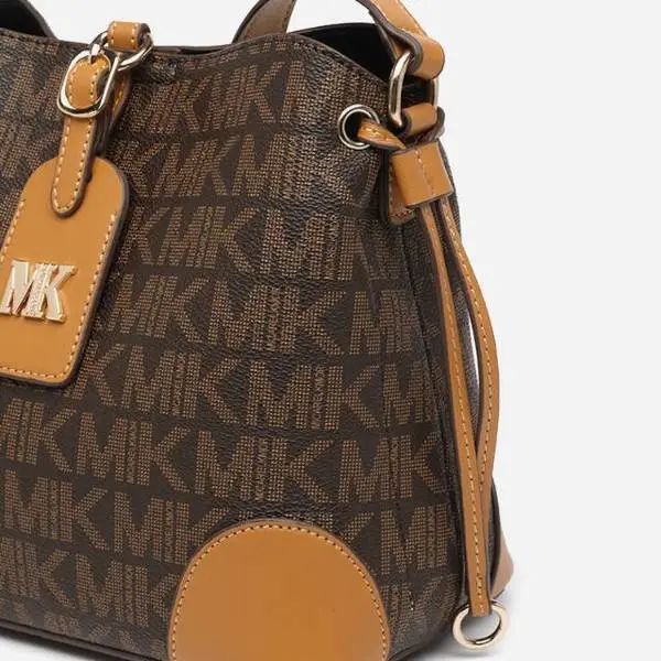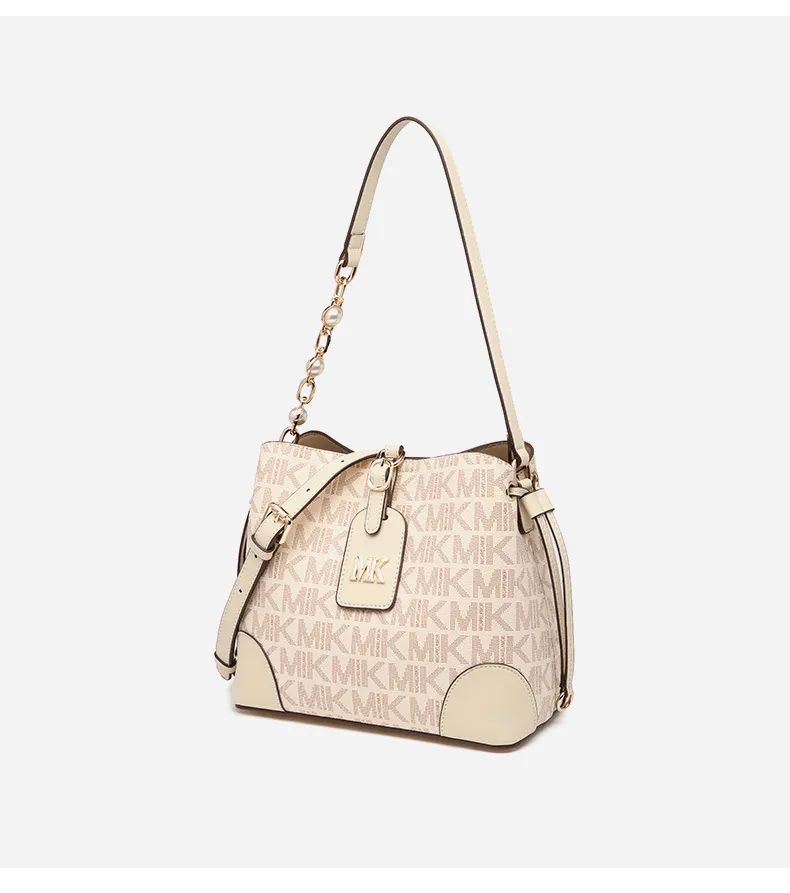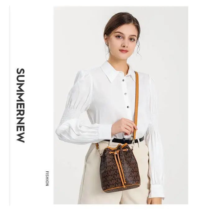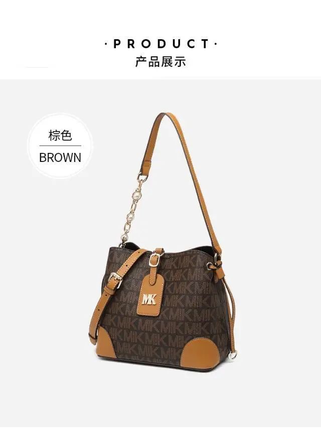 推品25 【品牌】:MICAREL KMOR(英国MK) 【货号】:MK8322-B (新) 【品名】:单肩新款水桶包 【颜色】:棕色/米色 【材质】:PVC/牛皮 【尺寸】:13*12*17 【风格】:极简,复古 【款式】:单肩包/斜跨