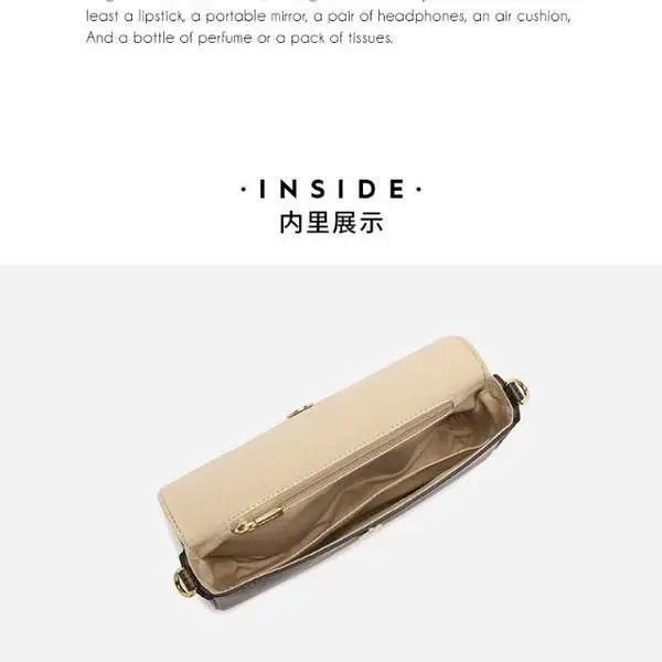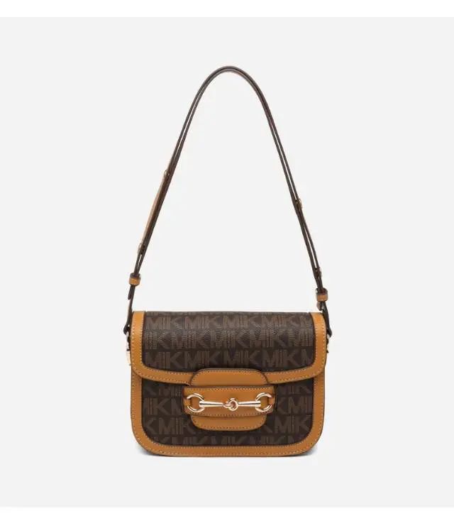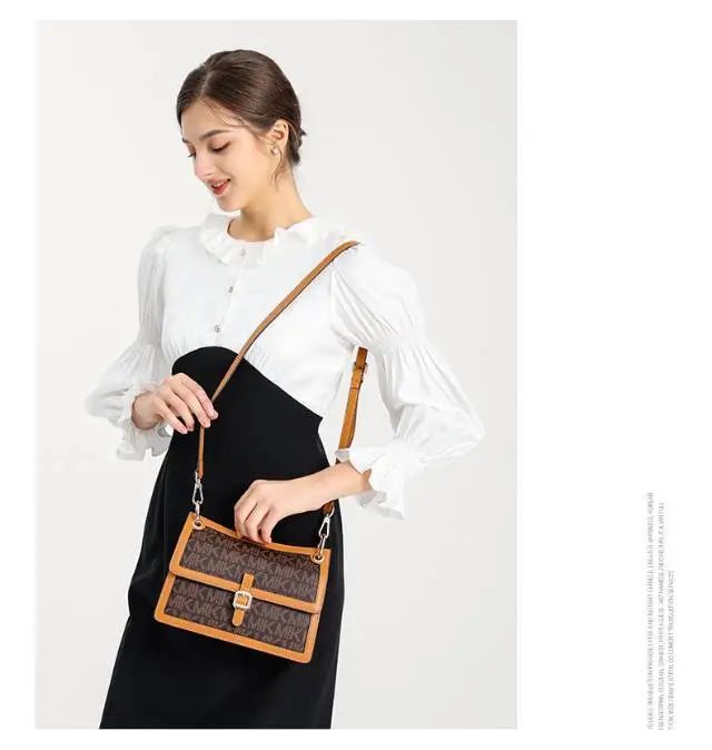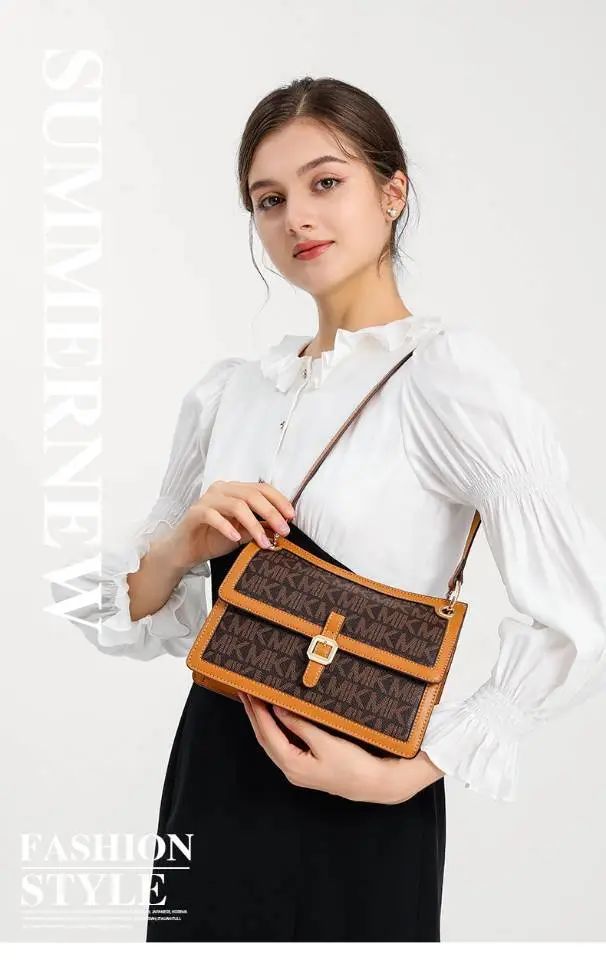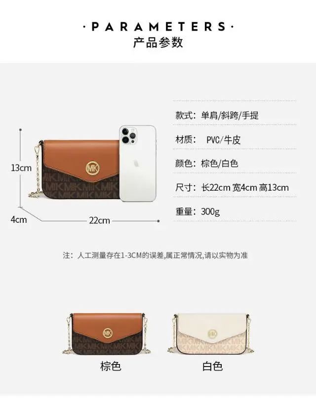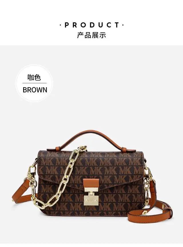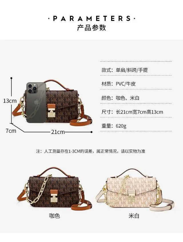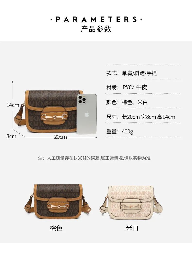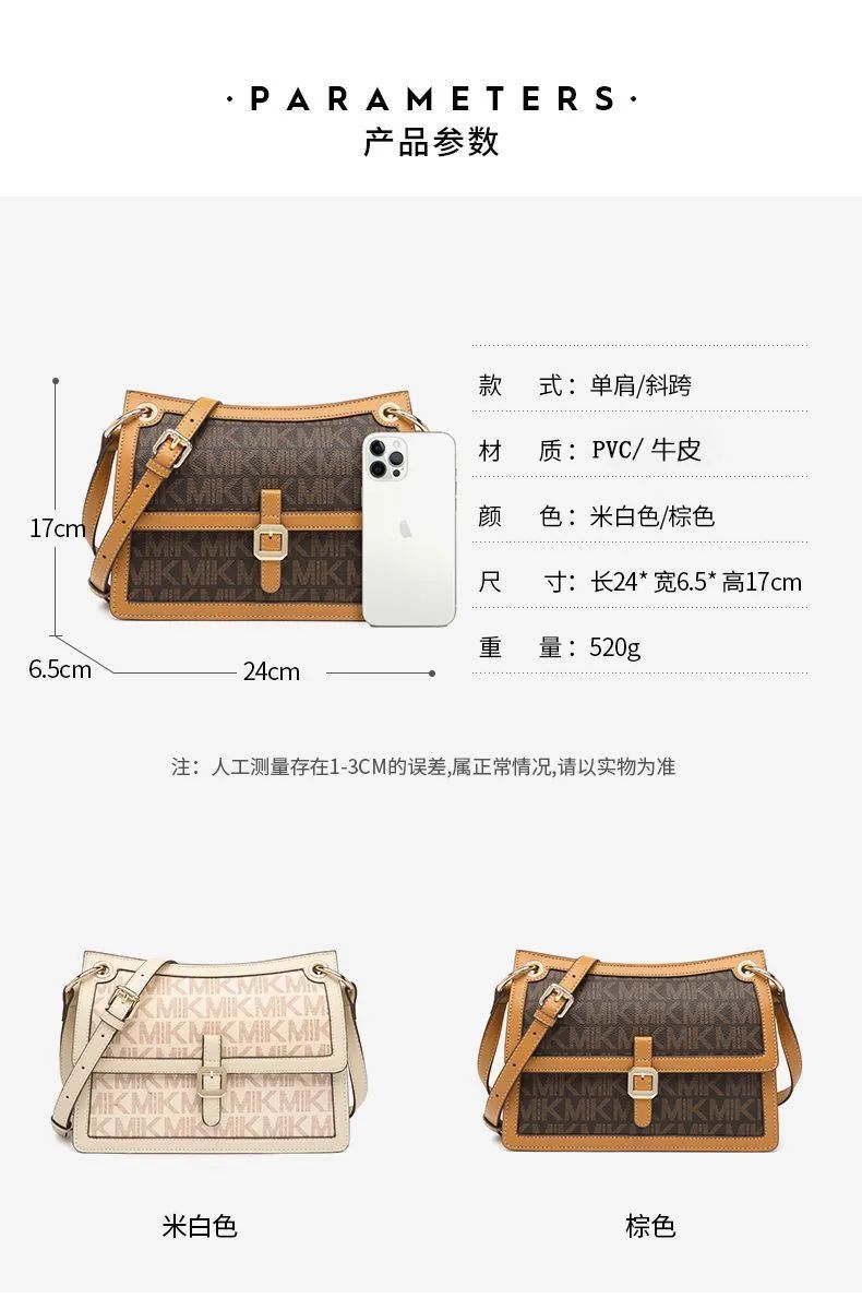 推品12 【品牌】:MICAREL KMOR(英国MK) 【货号】:MK8901 【品名】:白领高级感单肩包 【颜色】:棕色/米白 【材质】:PVC/牛皮 【肩带】: 可拆卸 肩带约110cm 【尺寸】:20cm*8*14 【风格】:极简,复古 【款式】:单肩包/斜跨