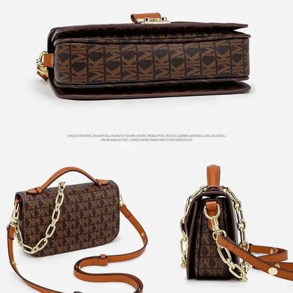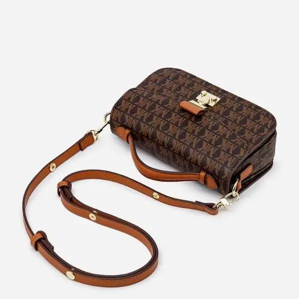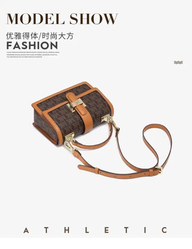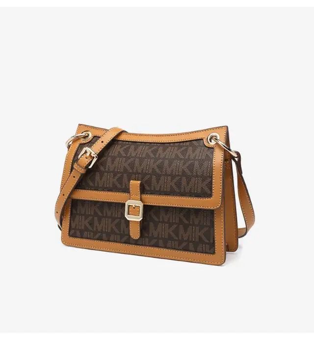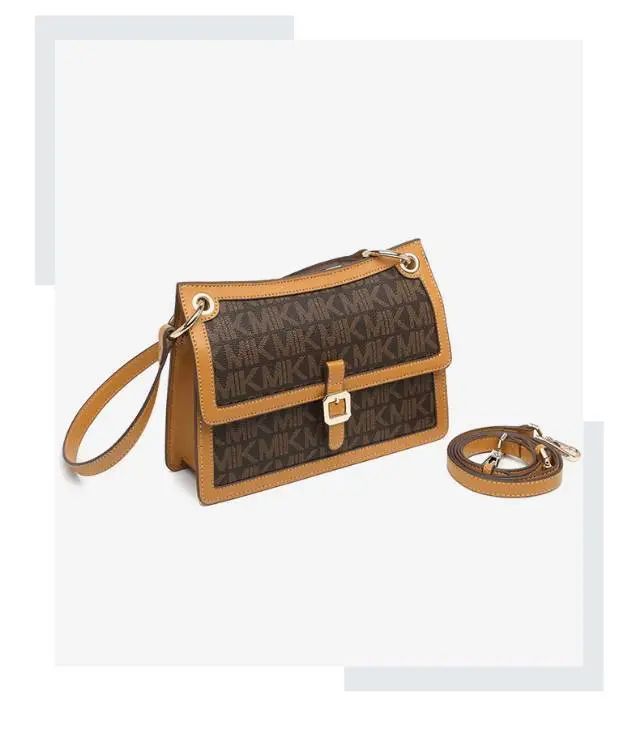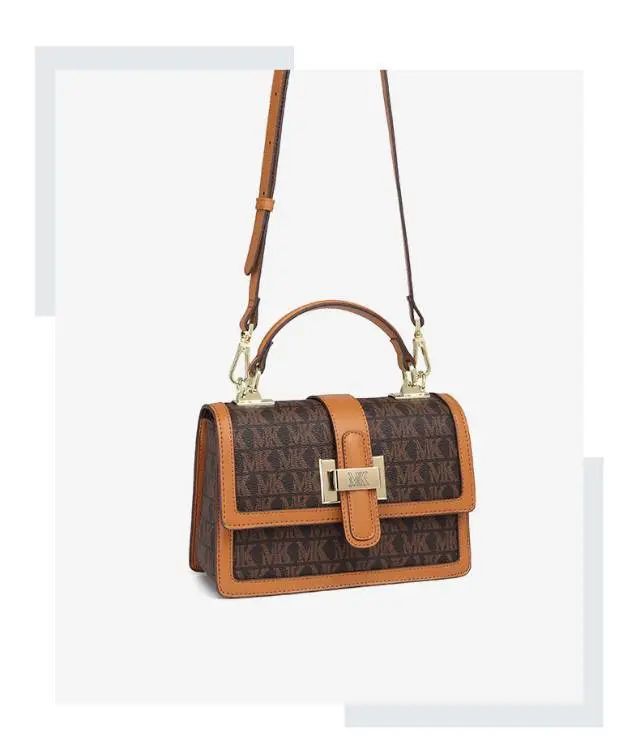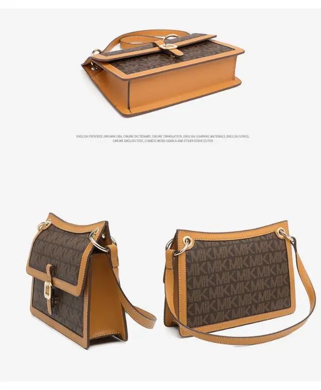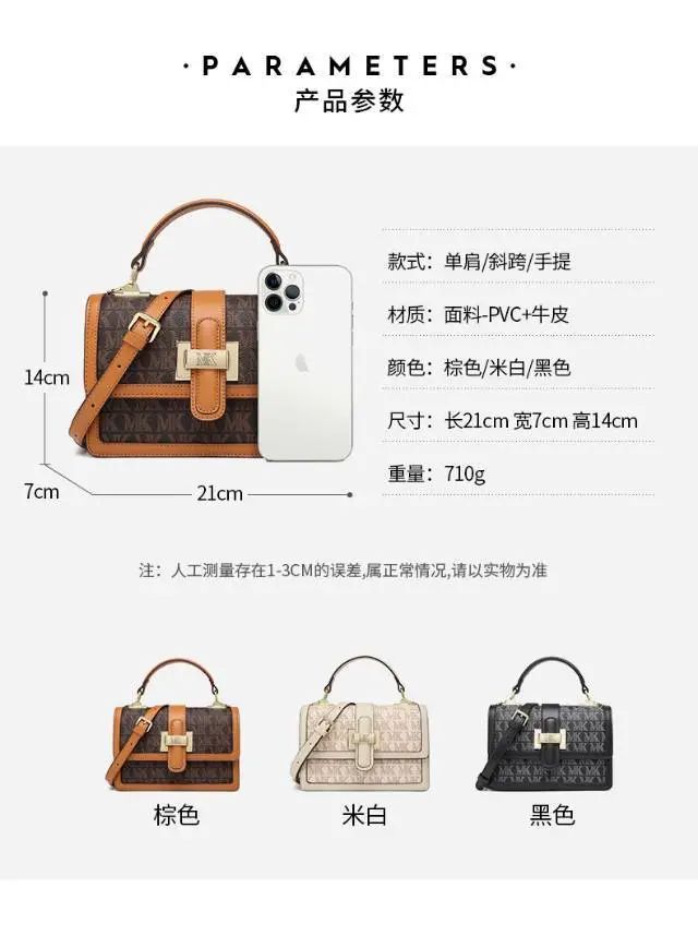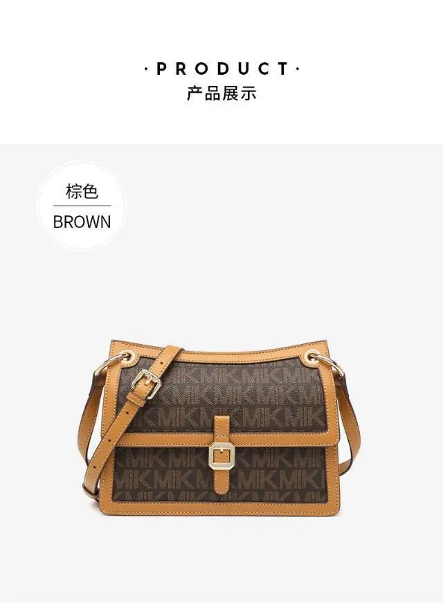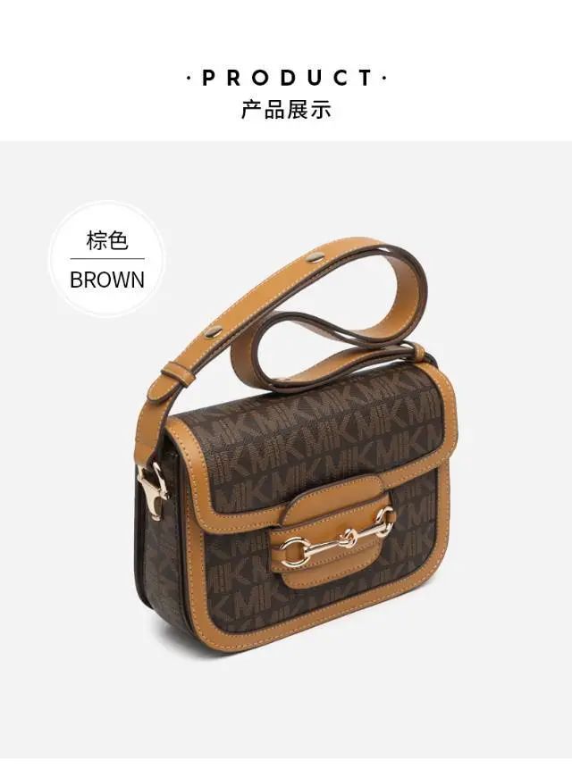 推品3 【品牌】:MICARELKMOR(英国MK)MK8978 【品名】:单肩斜挎包邮差包 【颜色】:咖色/米白 【材质】:PVC/牛皮 【尺寸】:21*7*13cm 【风格】:极简,复古 【款式】:单肩包。可拆卸肩带。
