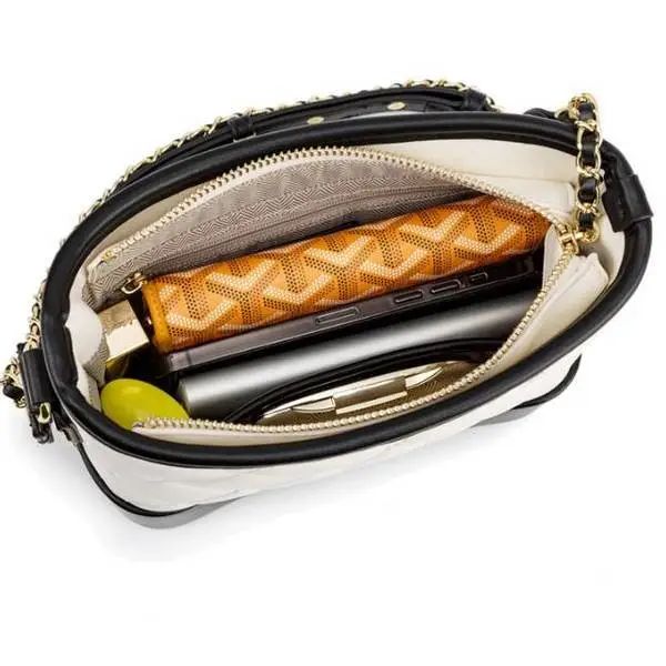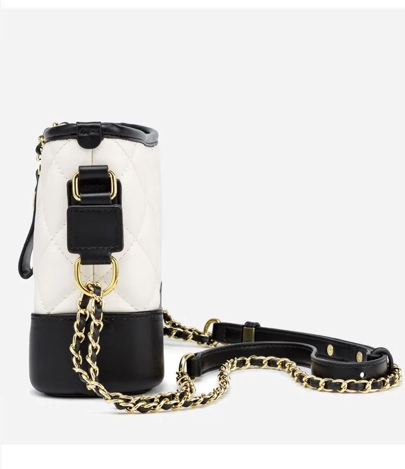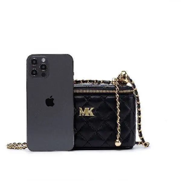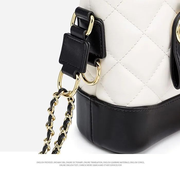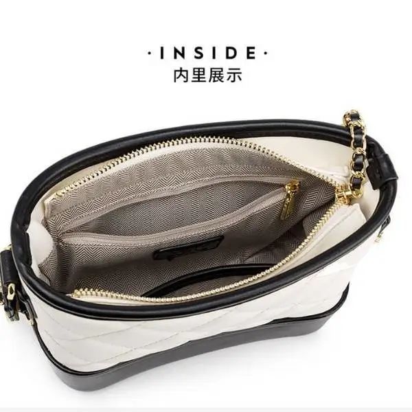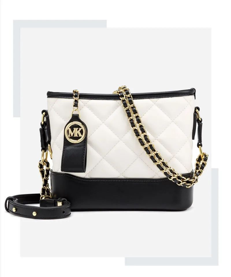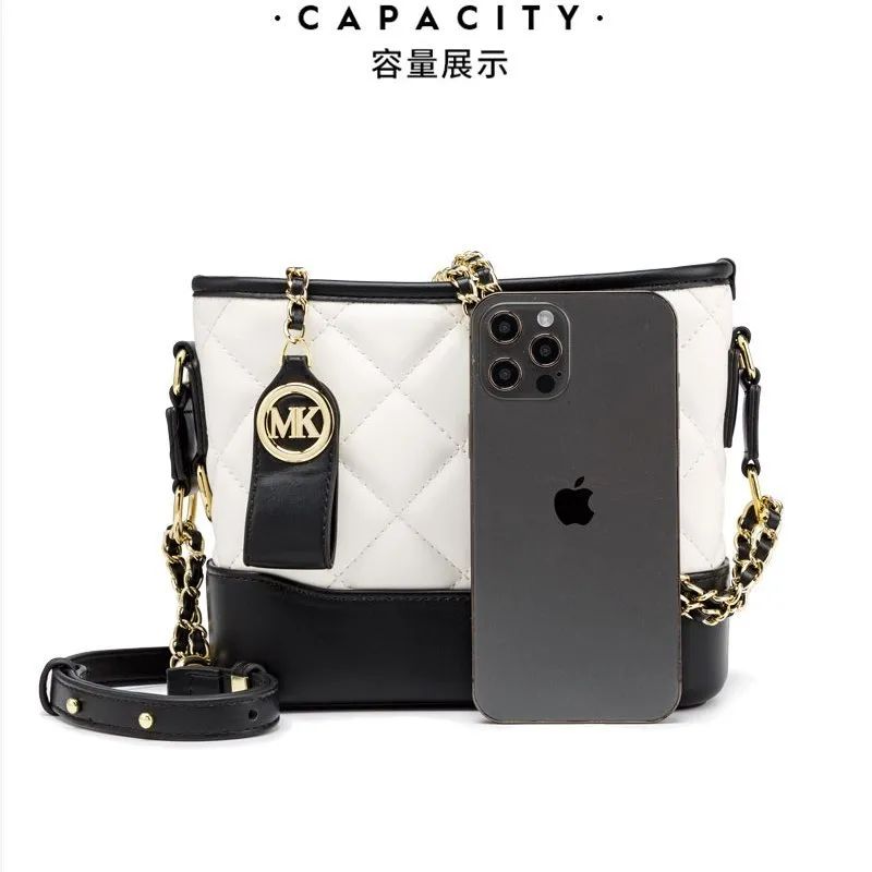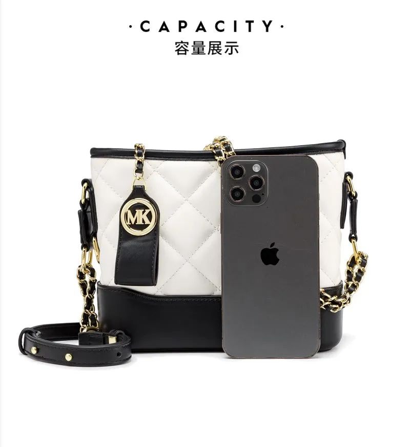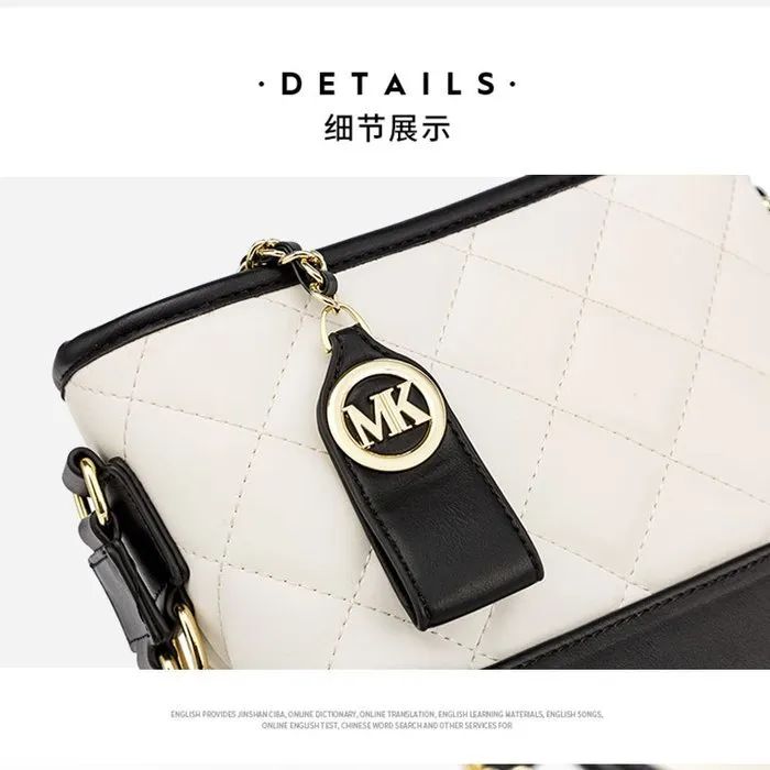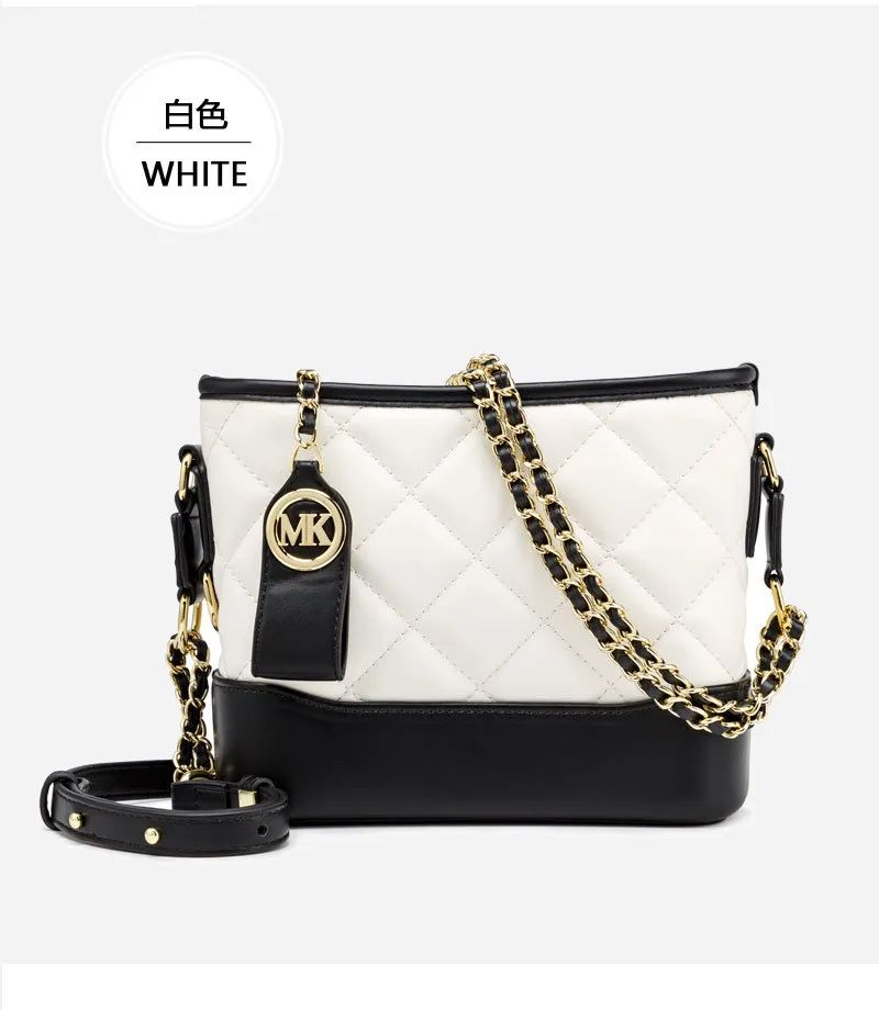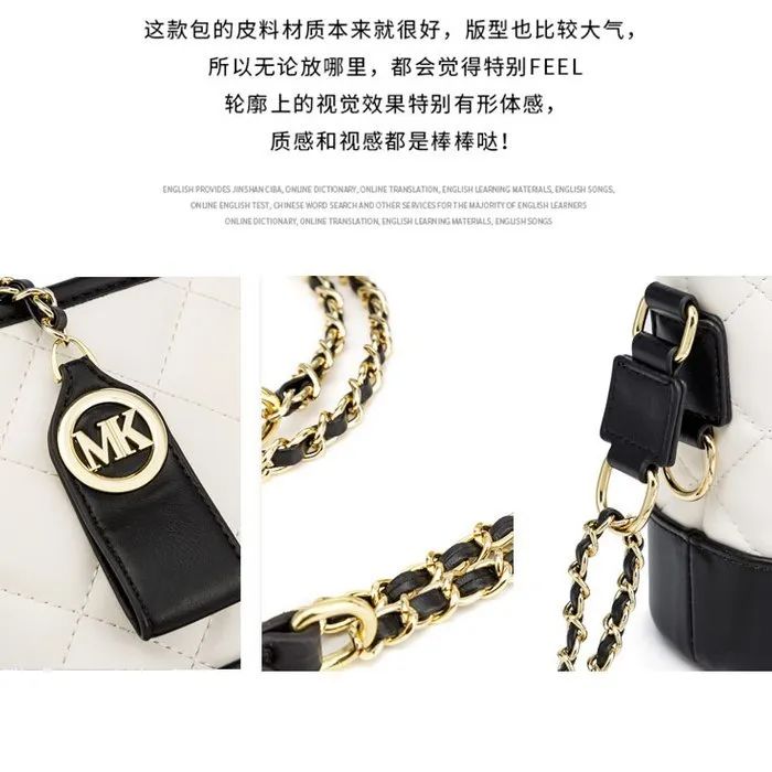 推品23 【品牌】:MICAREL KMOR(英国MK) 【货号】:MK8963 【品名】:小香风菱格链条包包 【颜色】:黑色/白色 【材质】:超纤皮革/牛皮 【尺寸】:20cm*7.5cm*17cm 【风格】:极简,流浪包 【款式】:单肩/斜挎/手提