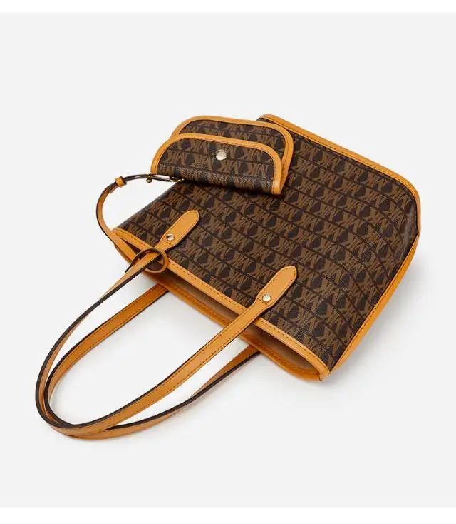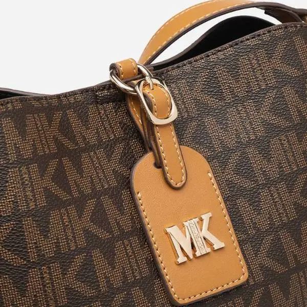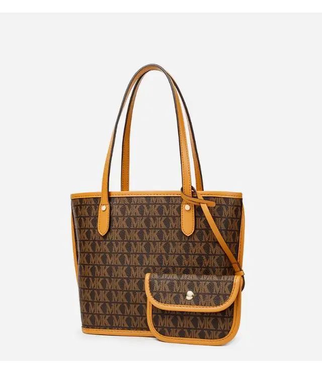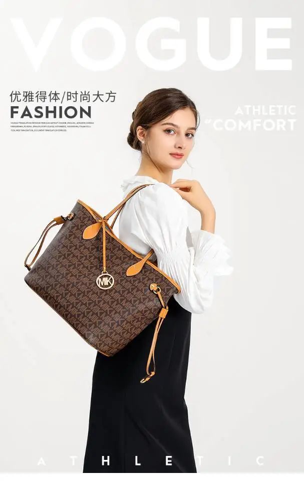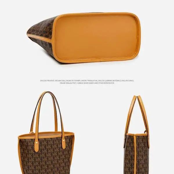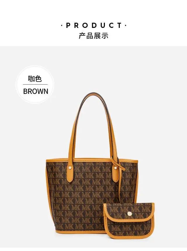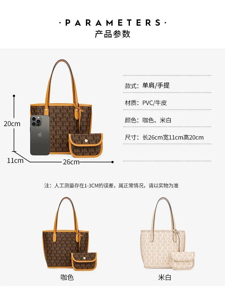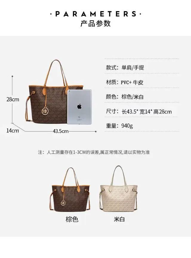推品16 【品牌】:MICARELKMOR(英国MK) 【货号】:MK8907 【品名】:大容量单肩手提包子母包 【颜色】:棕色/米白 【材质】:PVC/牛皮 【尺寸】:43.5cm*14cm*28cm 【风格】:极简,复古 【款式】:单肩包/斜跨