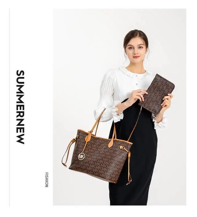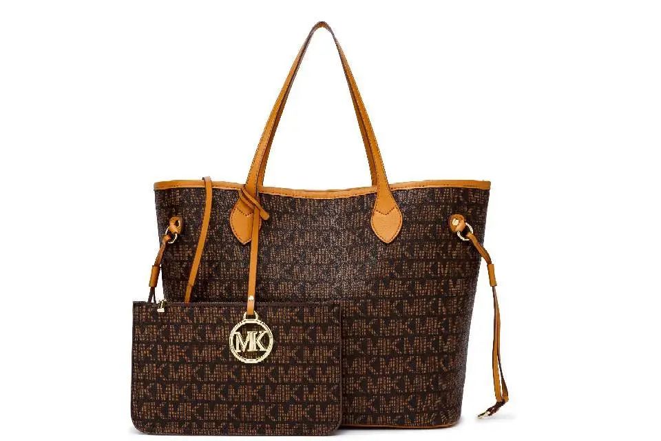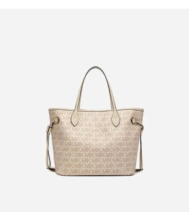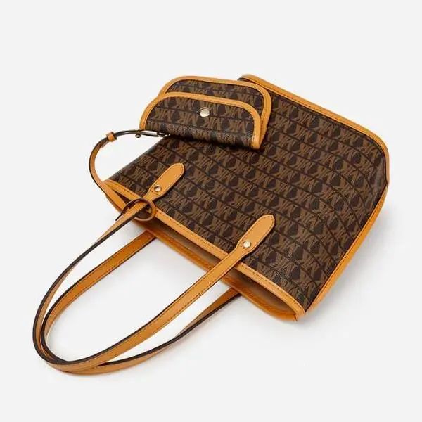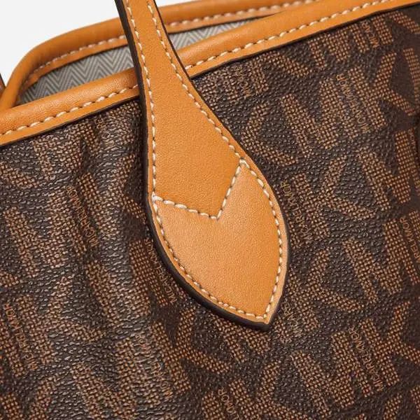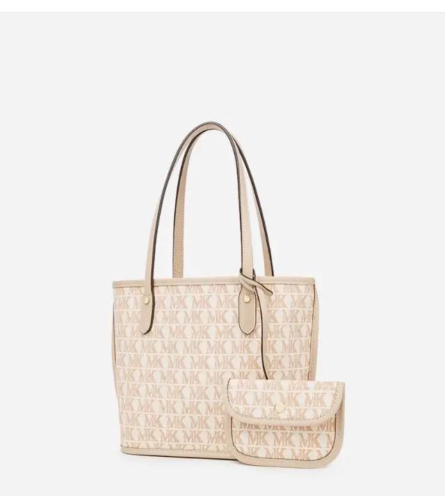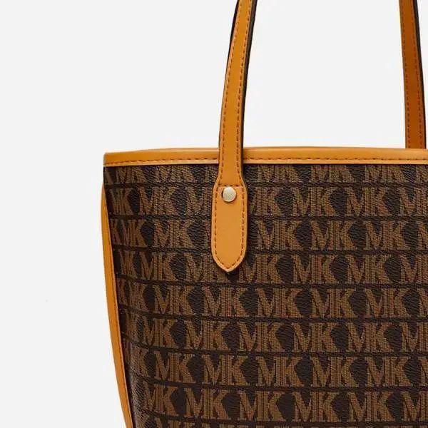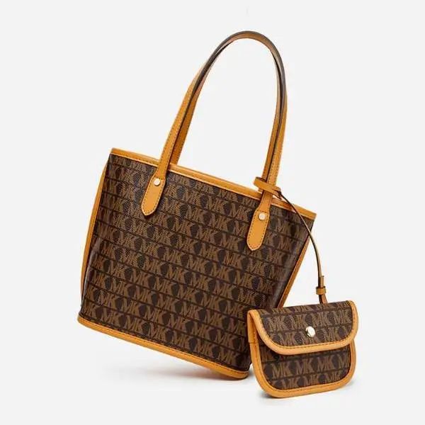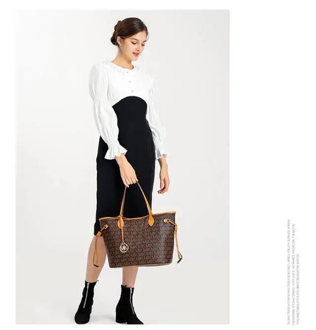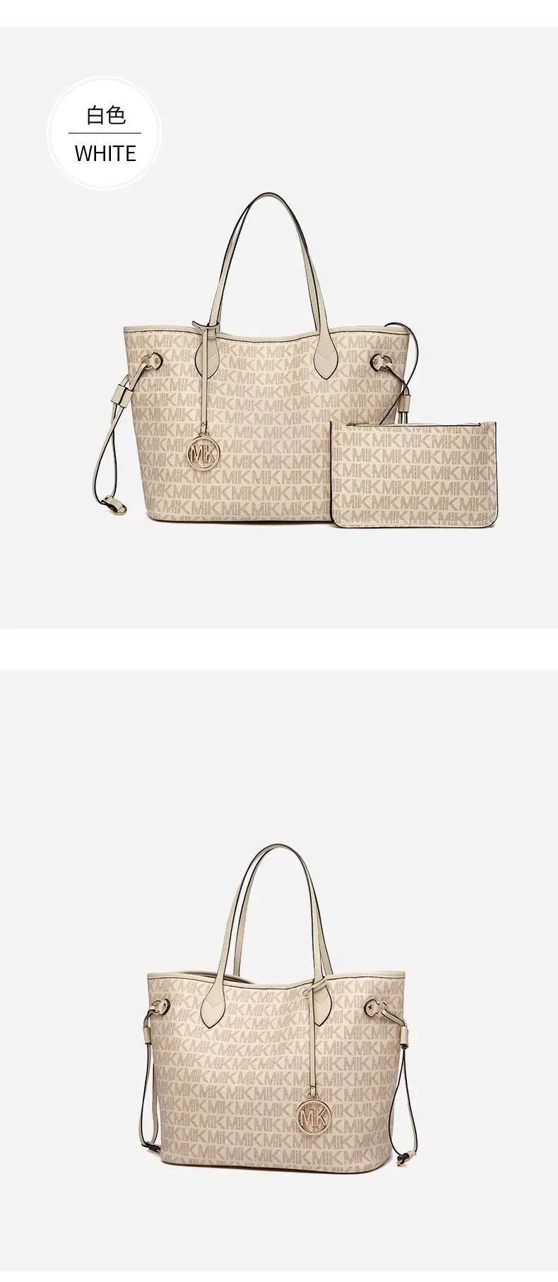 推品16 【品牌】:MICARELKMOR(英国MK) 【货号】:MK8907 【品名】:大容量单肩手提包子母包 【颜色】:棕色/米白 【材质】:PVC/牛皮 【尺寸】:43.5cm*14cm*28cm 【风格】:极简,复古 【款式】:单肩包/斜跨