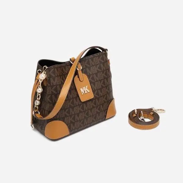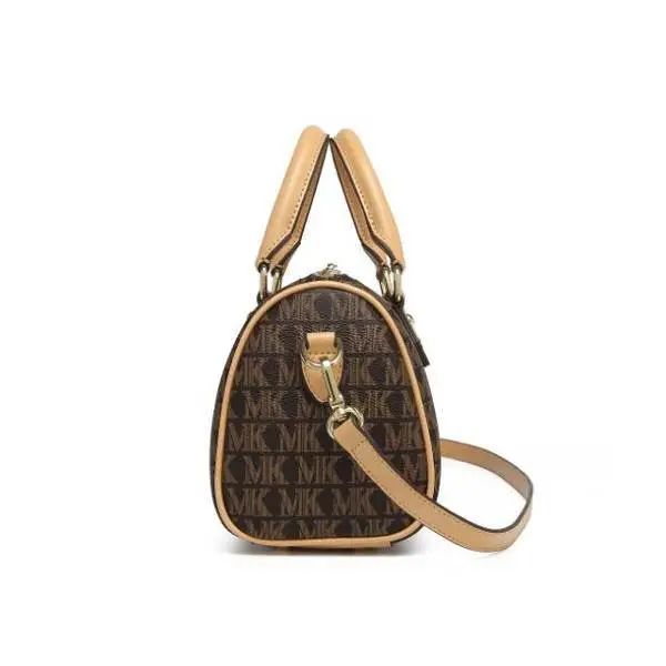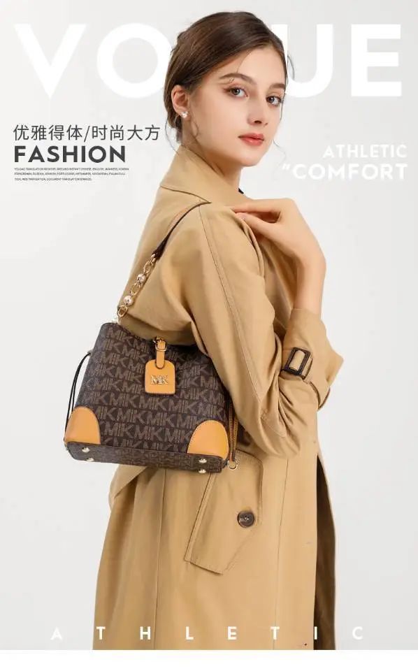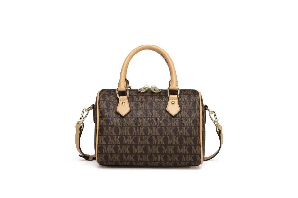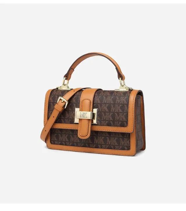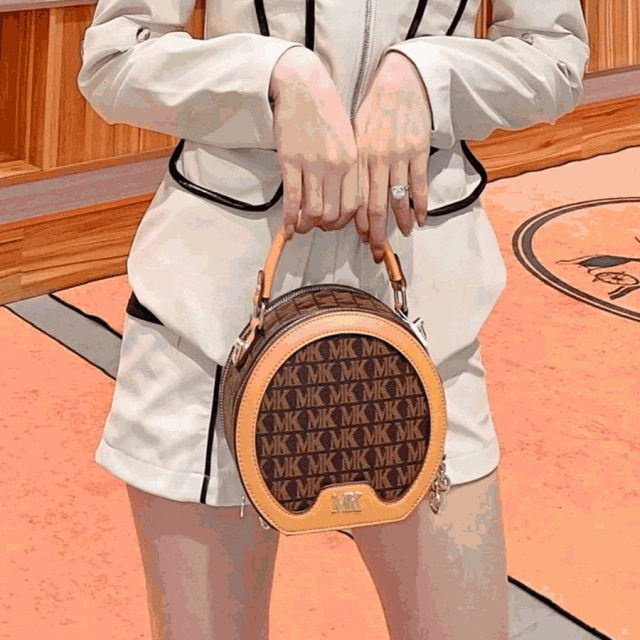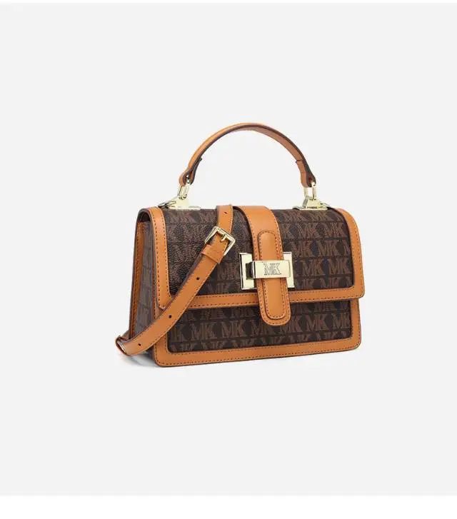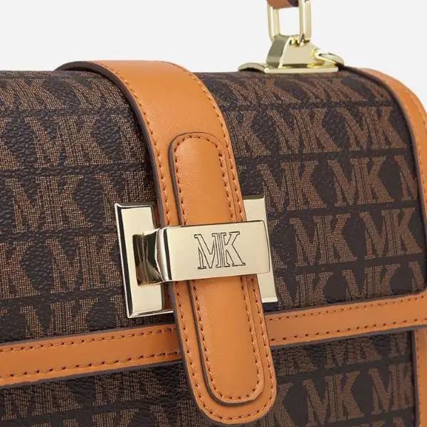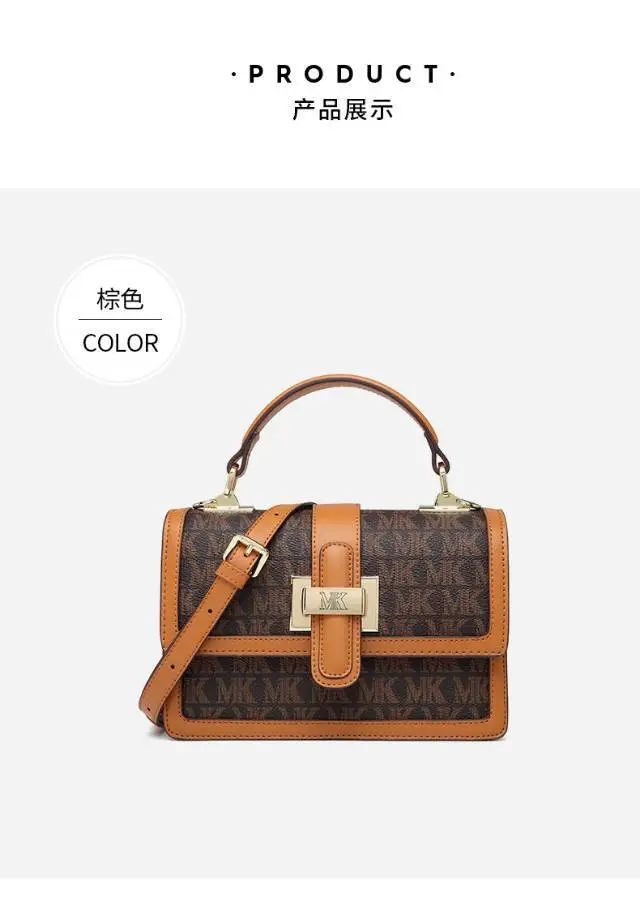 推品10 【品牌】:MICARELKMOR(英国MK) 【货号】:MK8987 【品名】:单肩手提包包 【颜色】:咖色/米白 【材质】:PVC/牛皮 【尺寸】:26*11*20cm 【风格】:极简,复古 【款式】:单肩/手提