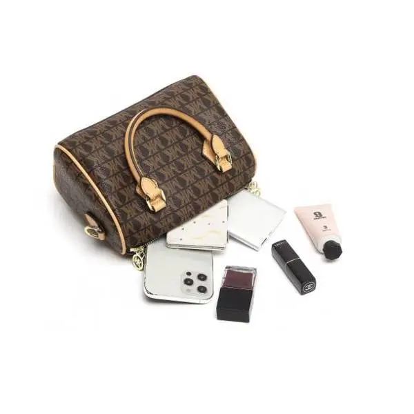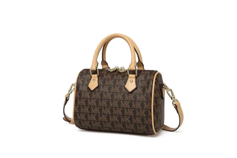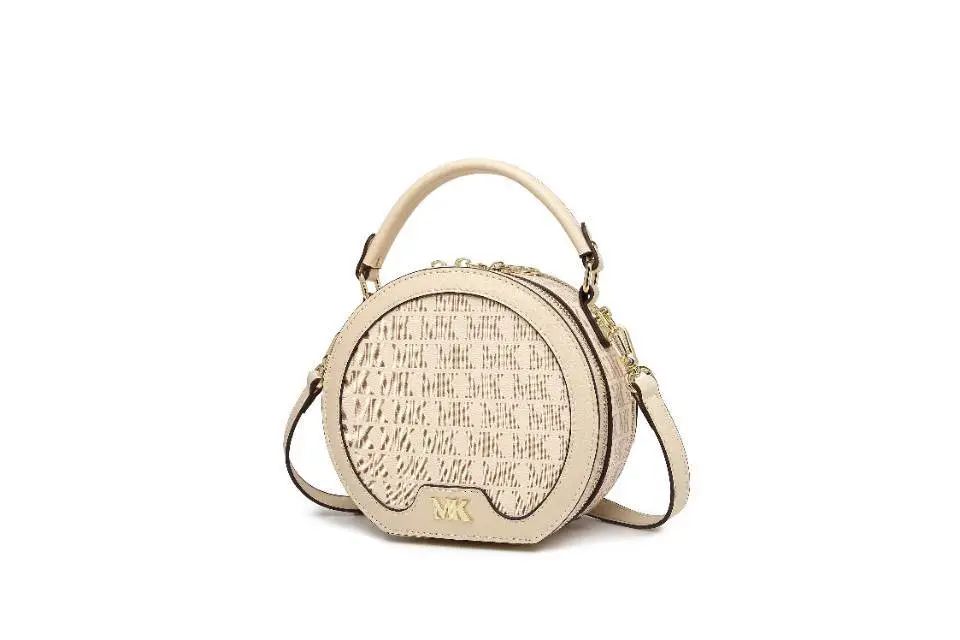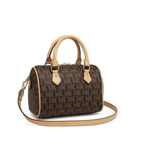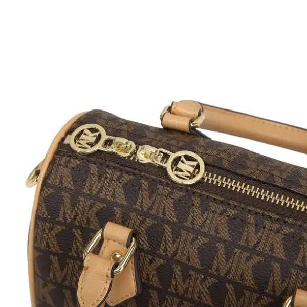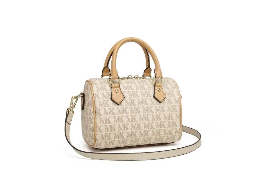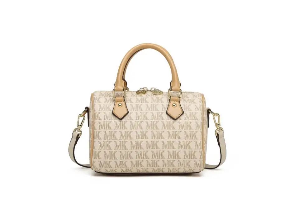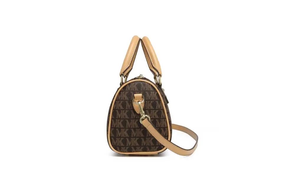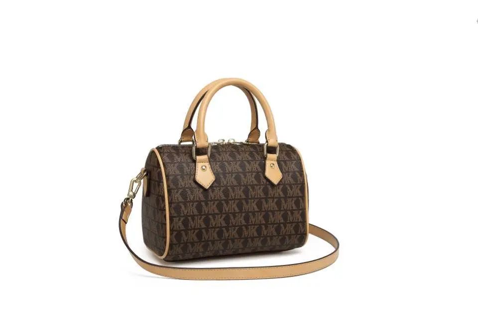 推品10 【品牌】:MICARELKMOR(英国MK) 【货号】:MK8987 【品名】:单肩手提包包 【颜色】:咖色/米白 【材质】:PVC/牛皮 【尺寸】:26*11*20cm 【风格】:极简,复古 【款式】:单肩/手提
