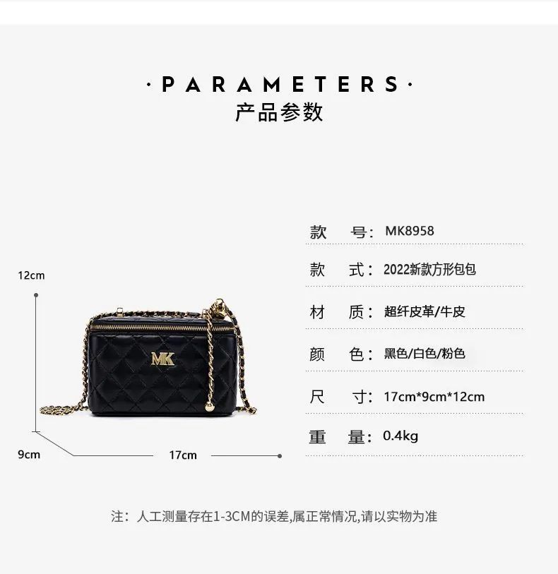 推品22 【品牌】:MICAREL KMOR(英国MK) 【货号】:MK8958 【品名】:2022新款方形包包 【颜色】:黑色/白色/粉色 【材质】:超纤皮革/牛皮 【尺寸】:17cm*9cm*12cm 【风格】:极简,复古 【款式】:单肩/手提/斜跨