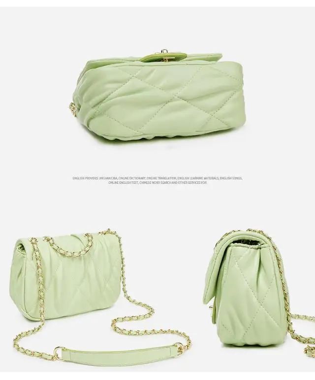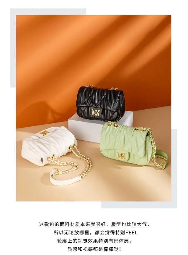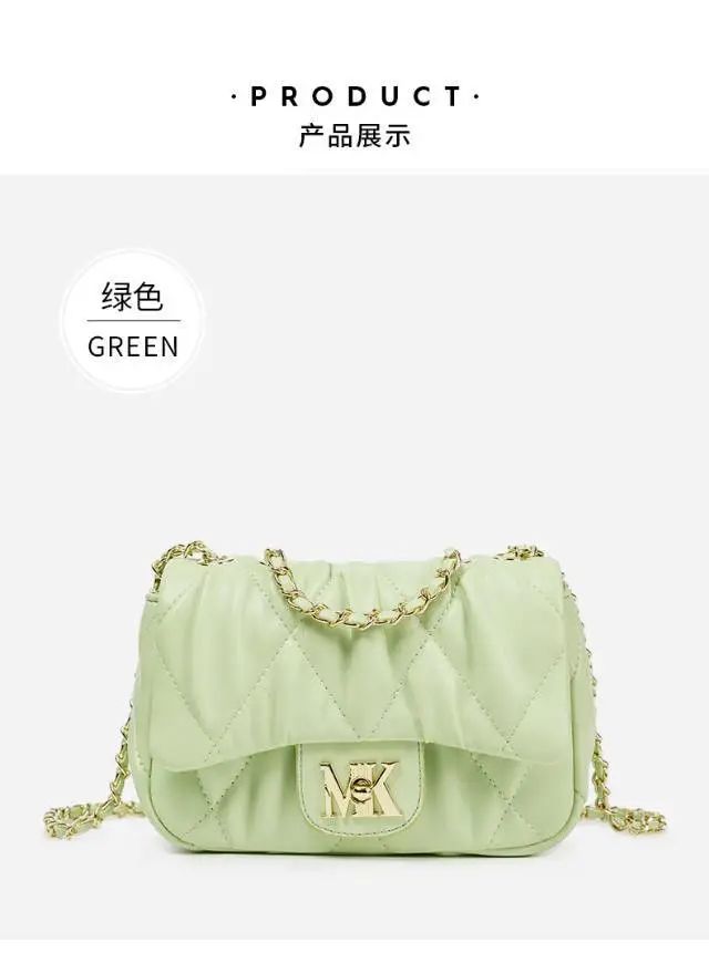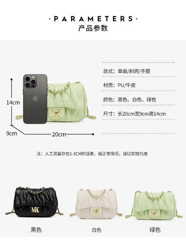 推品9 【品牌】:MICARELKMOR(英国MK) 【货号】:MK8986 【品名】:菱格小香风单肩包 【颜色】:黑色/白色/绿色 【材质】:PU/牛皮 【尺寸】:20*9*14cm 【风格】:极简,复古 【款式】:单肩/斜挎/手提