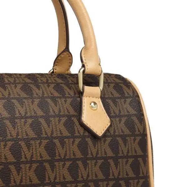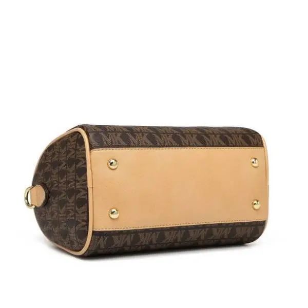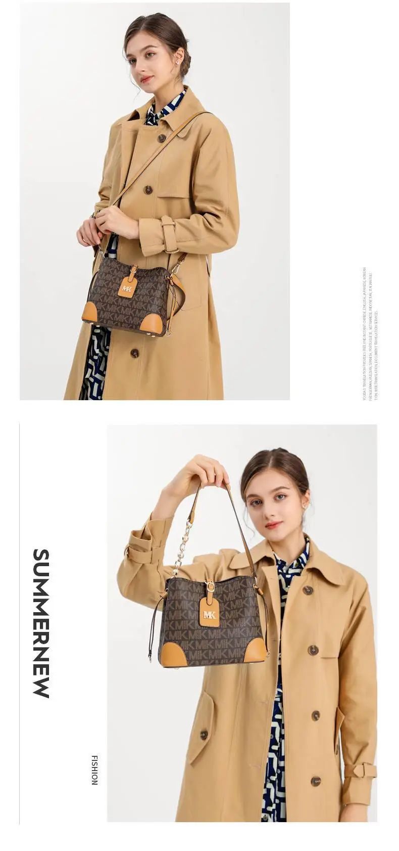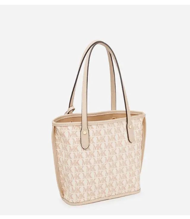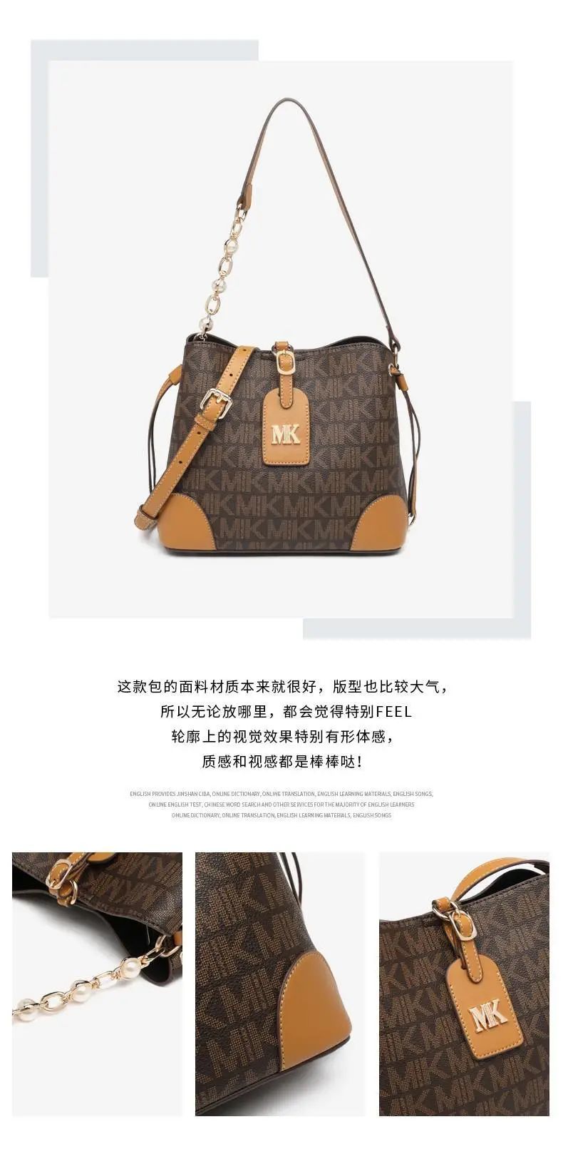 推品7 【品牌】:MICARELKMOR(英国MK) 【货号】:MK8982 【品名】:单肩手提包包 【颜色】:咖色/米白 【材质】:PVC/牛皮 【尺寸】:35*14*30cm 【风格】:极简,复古 【款式】:单肩/手提