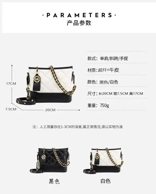 推品2 【品牌】:MICARELKMOR(英国MK)MK8989 【品名】:经典绣线单肩斜挎包包 【颜色】:黑色/白色 【材质】:超纤/牛皮 【尺寸】:22*8*14cm 【风格】:极简,纯色 【款式】:单肩/斜挎/手提