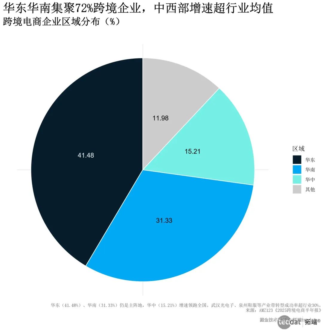 72%的跨境企业扎堆华东(41.48%)和华南(31.33%),但武汉光电子、泉州鞋服正在逆袭。中山灯饰产业带靠亚马逊SPN服务商,把大件物流成本砍了50%,配送从30天缩到3天,这就是“服务商+产业带”的魔力。