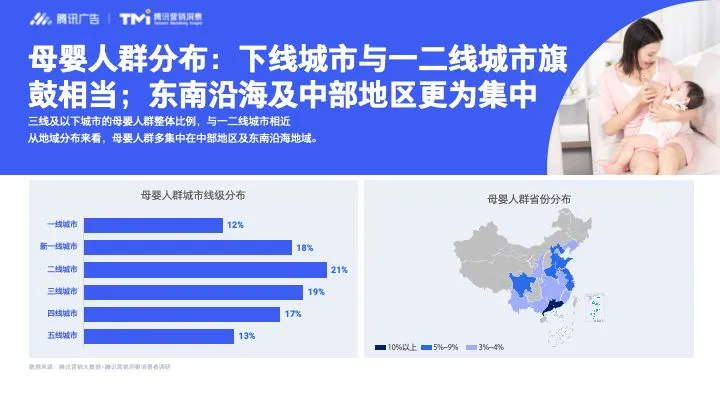 从城市分布来看,在三线及以下城市的母婴人群占比与一二线城市相近,各占一半左右,且多集中在中部地区及东南沿海等区域。