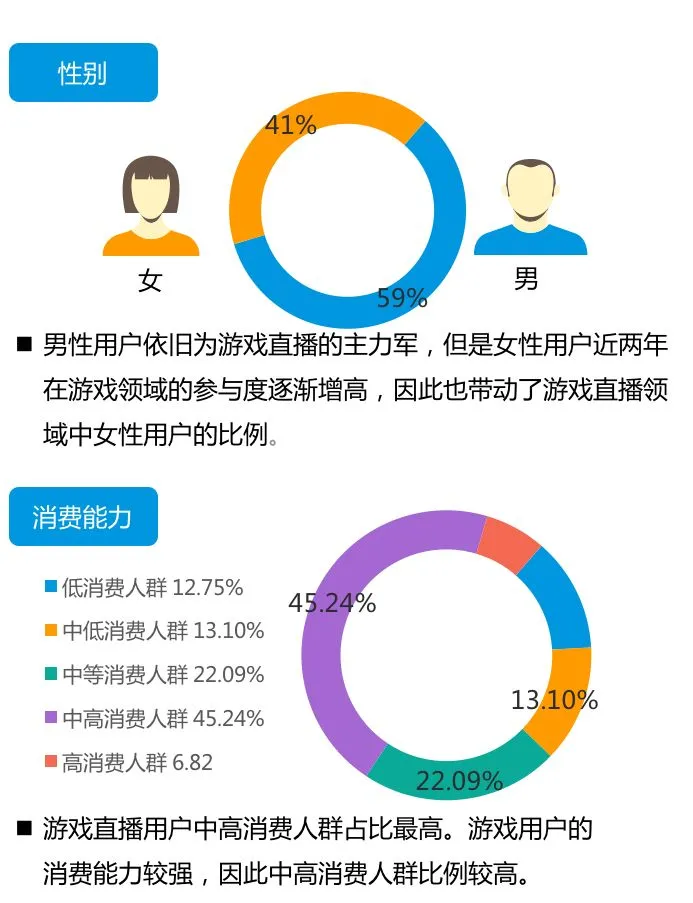 ▌游戏直播性别平衡化,85后为游戏直播平台主力军,游戏直播用户较多金