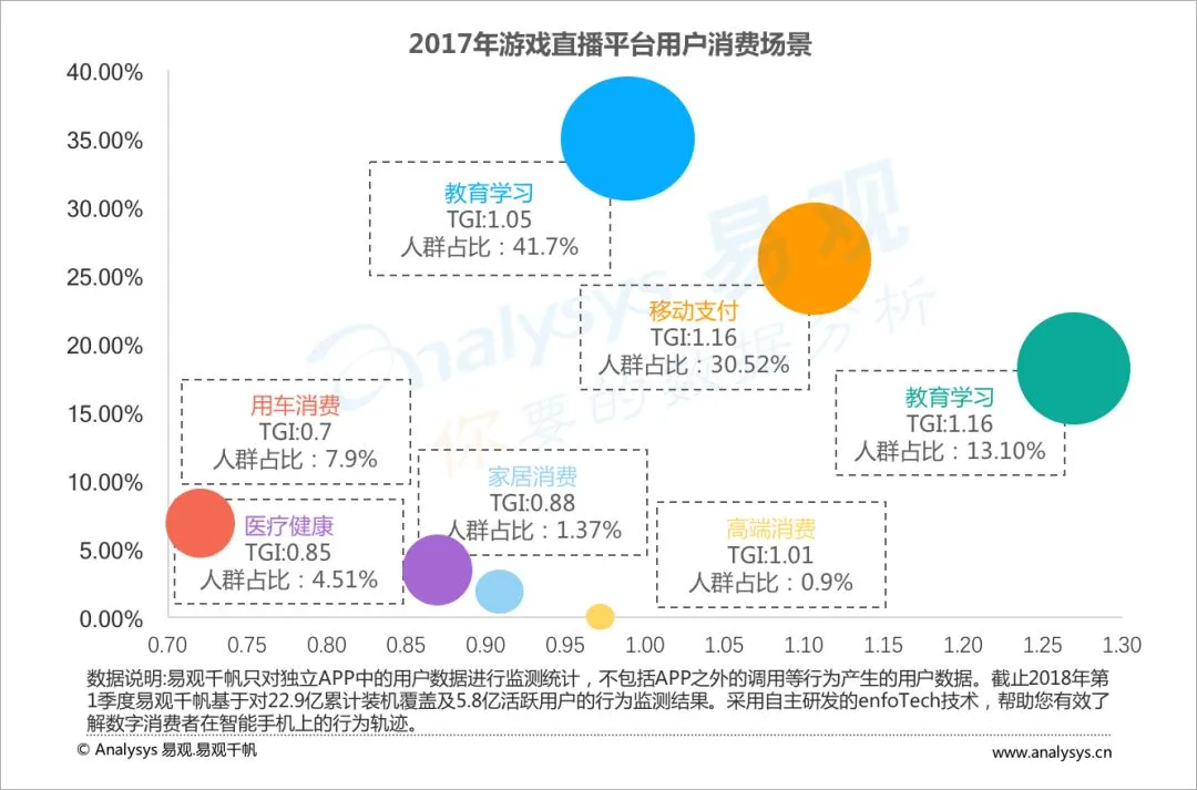游戏直播用户消费场景主要集中在日常消费,移动支付,教育学习,用车消费,医疗消费,家居家饰,高端消费与教育学习。随着支付宝等一些列移动支付软件的普及,越来越多的用户开始去现金化消费,因此移动支付TGI指数最高。此外因为游戏直播中大部分用户为85后,90后,90后群体中大部分还处于高中大学学习阶段因此教育学习消费比重较大,同时从气泡大小可以看出这部分群体占比较高。而85后群体中,大部分处于收入较为稳定的时期,开始买房买车因此这两个消费场景比例同样较高。观看游戏直播用户中也不乏一些土豪级别的人物,因此存在一部分高端消费的群体。