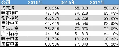 2015年-2017年,餐厅经营和外卖收入加总分别为56.53亿元、76.36亿元、103.88亿元,占营收的比例分别为98.2%、97.8%、97.6%。