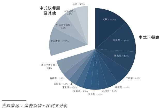 中国餐饮市场可分为三部分,即中式餐饮、西式餐饮及其他餐饮。中式餐饮又可分为火锅、各省地方菜系如川菜、粤菜、湘菜、本帮江浙菜、中式快餐等。其中,火锅在中国餐饮市场占据最大市场份额。2017年,火锅的市场份额为13.7%。之前我们说火锅是中国餐饮业最好的赛道,此处数字可佐证。