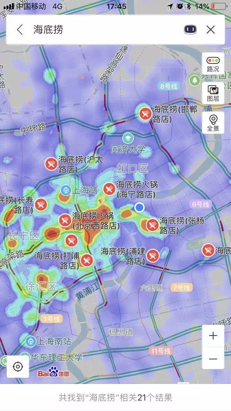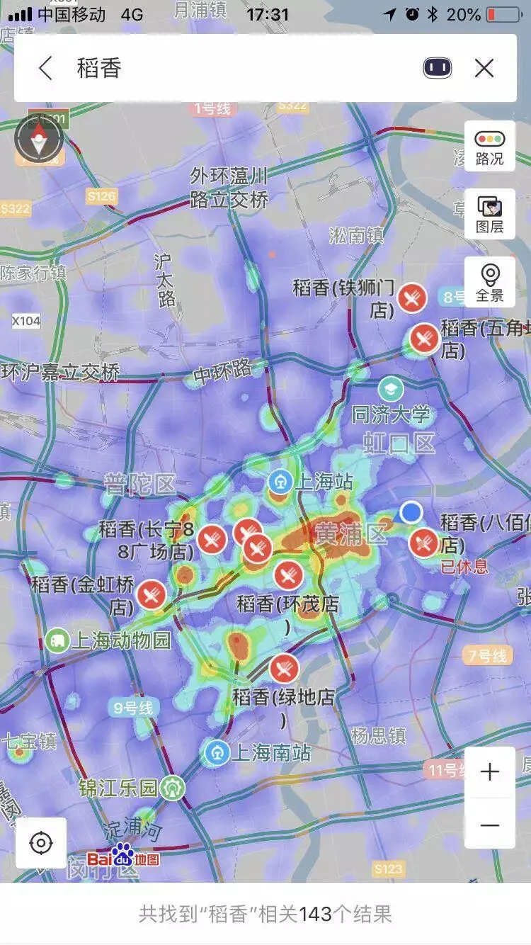 图有点多,耐心看能看出一点小细节:海底捞、味千、国际天食选址所处大多在人流密集的商圈。而像呷哺呷哺、稻香,则不一定紧靠密集人流区。