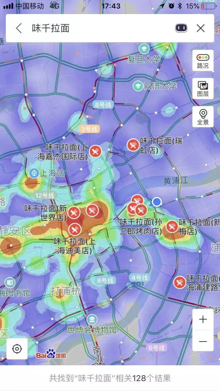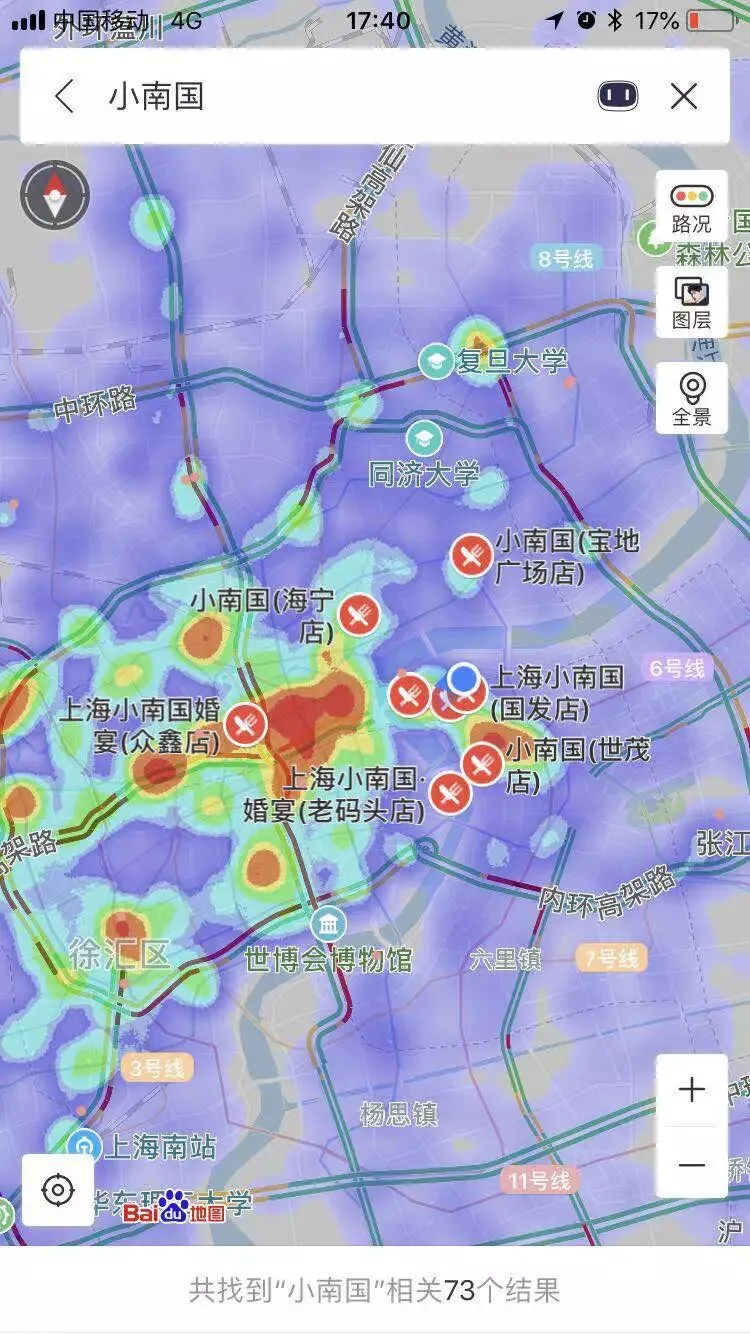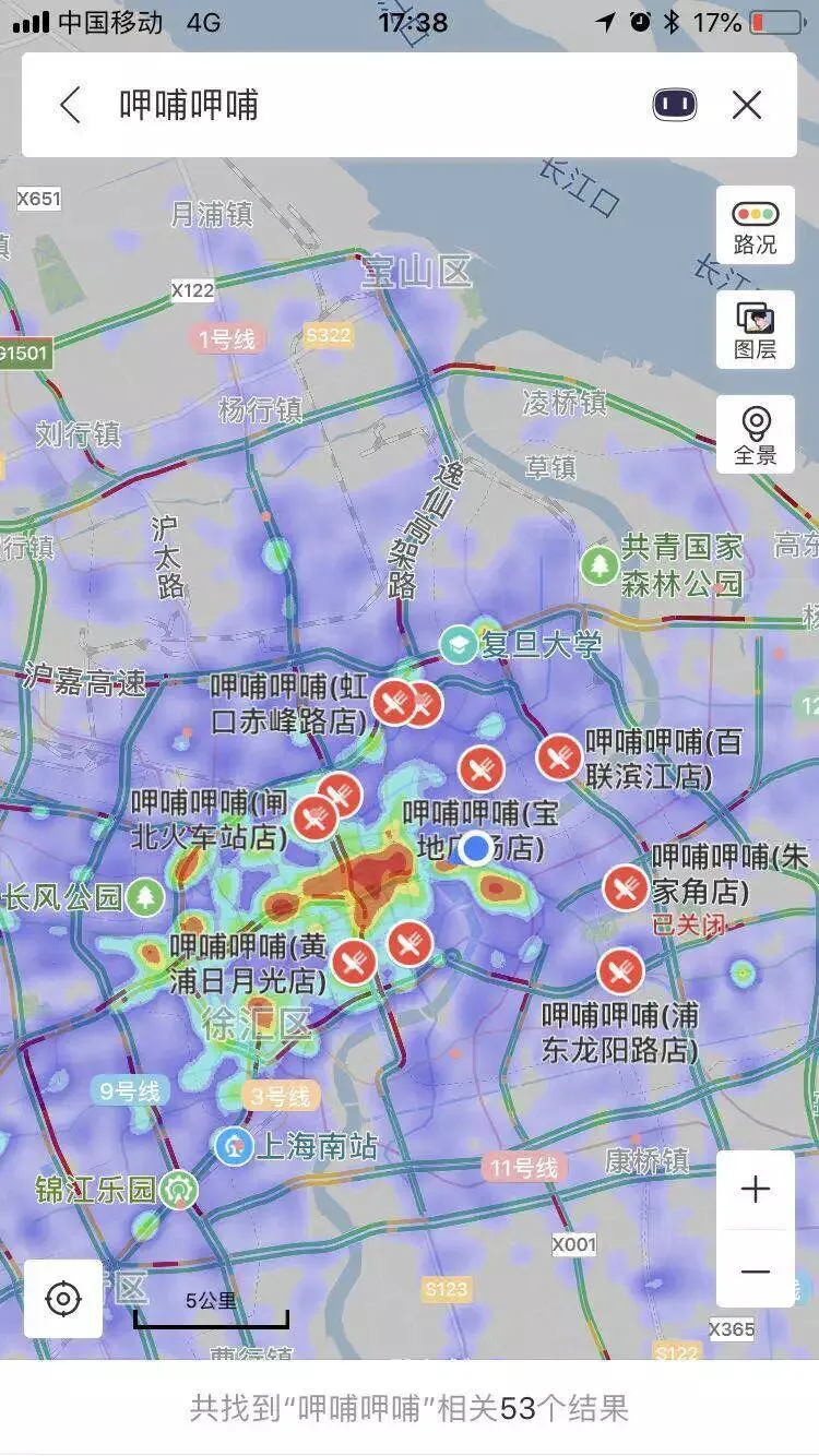 具体门店所处位置,我们以上海为坐标,从百度热力图来看各家情况:颜色越深的地方,人流量越多。