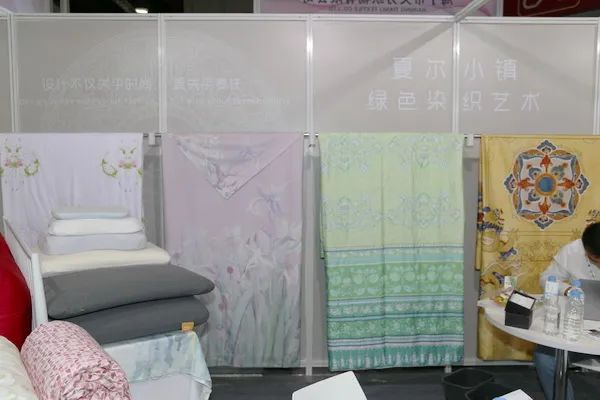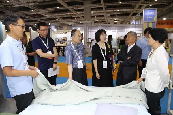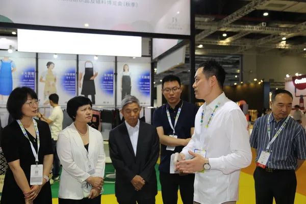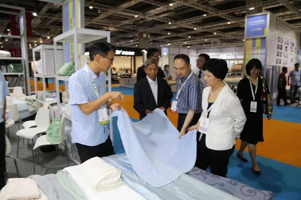 在圆梦家纺展位上,朱会长一行对圆梦家纺的新工艺家纺面料大加赞赏,圆梦家纺大胆采用新材料及研发新工艺,使其产品在国内外市场深受好评。