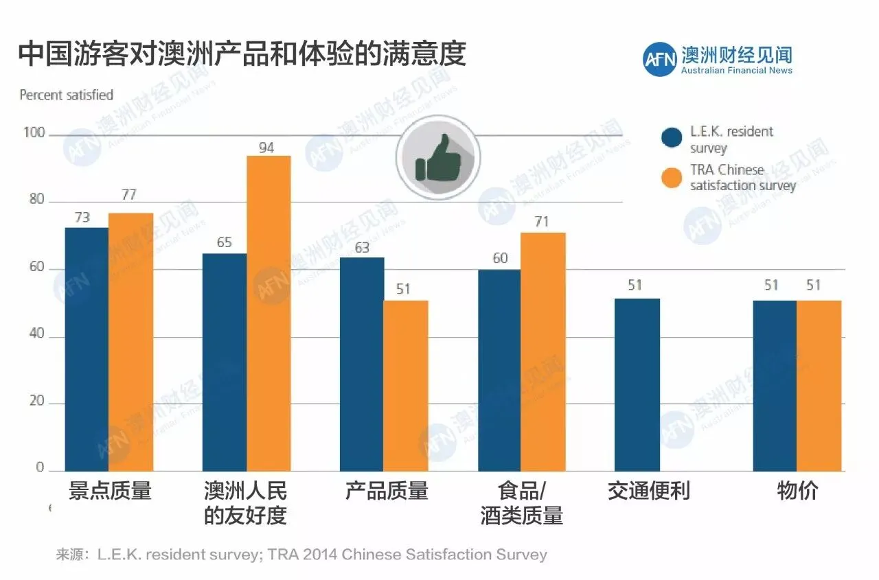 中国人基本上保持着对澳大利亚旅游较高的满意度。根据两项权威调查的统计数据,我们可以得出结论:在景色、产品质量、食品和交通等指标上,澳大利亚的旅游都获得60以上的评分,但物价获得了最低的满意度评分,只有51分。