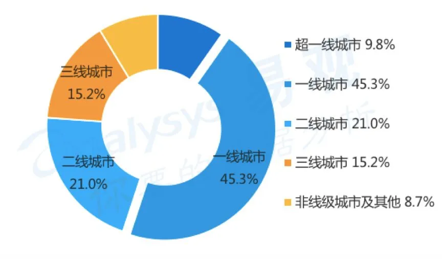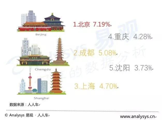 根据Analysys易观万像数据监测显示,中国二手车电商移动端用户的地域分布以一、二线城市为主,占比超过66% 。