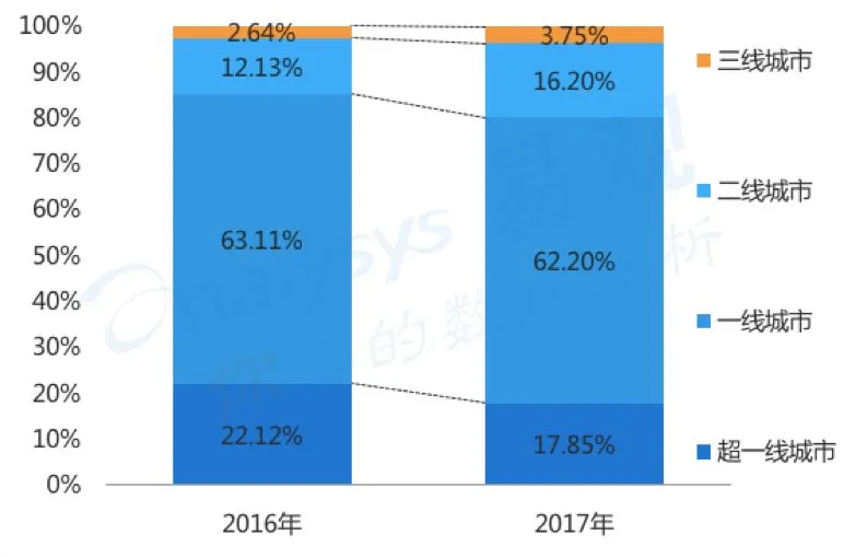 2016-2017年二手车电商各级城市车源量变化