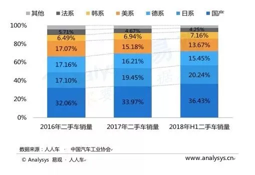 根据人人车平台和中国汽车工业协会数据显示,2018年上半年国产品牌二手车销量占比明显低于新车市场。由于耐用性、口碑等因素影响,国外品牌二手车相对更加保值。相比于新车市场,日系、美系、韩系等品牌在二手车市场上更受到消费者的欢迎。