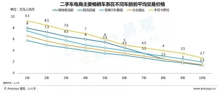 根据人人车平台多年二手车交易数据积累,对比不同车系的保值曲线,可以发现不同车系的贬值率整体呈现边际递减的规律,同时具体贬值速度具有时间上的差异,例如丰田卡罗拉在第4-6年相对贬值最快,而福特福克斯的贬值速度最快的则在第5-8年。二手车平台可以参考保值曲线来进行估价,同时买家和卖家可以参照贬值曲线来选择交易的车型和车龄。