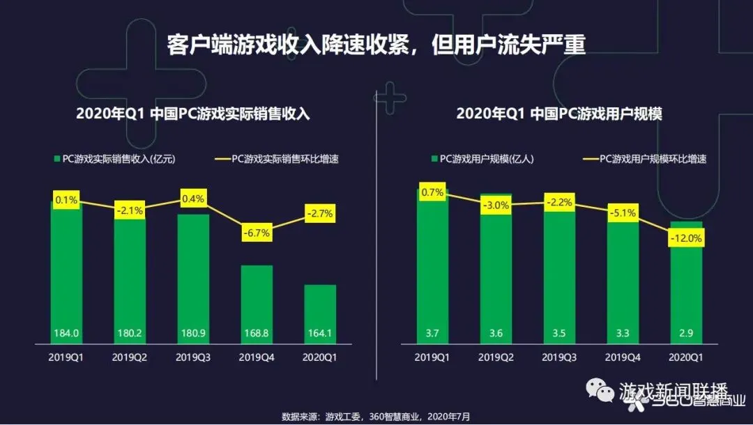 PC游戏方面,2020年Q1用户规模为2.9亿,同时,PC游戏销售收入为164.1亿元,增速为-2.7%,较2019年Q4的-6.7%,下降有所放缓,表明游戏用户的消费意愿和消费能力有所提升,同时360在Q2较Q1增幅20%左右,全年预计在20亿+以上,充分表明PC游戏销售额在进一步提升。