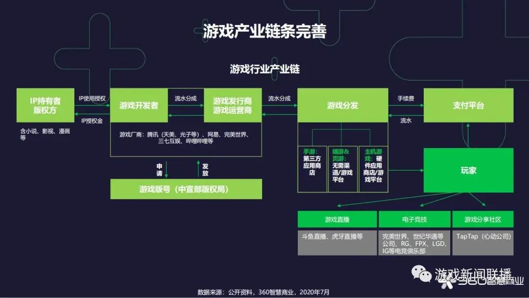 从360用户对游戏的关注度来看,围绕疫情前后一直处于高点波动,仅次于电商,远超金融、教育、医疗健康等行业,还有更大的发展空间。与此同时围绕IP持有方,游戏开发者,游戏发行商/运营商,游戏分发,支付平台,游戏直播,电子竞技,游戏分享社区和玩家的游戏产业链条已经日趋完善。