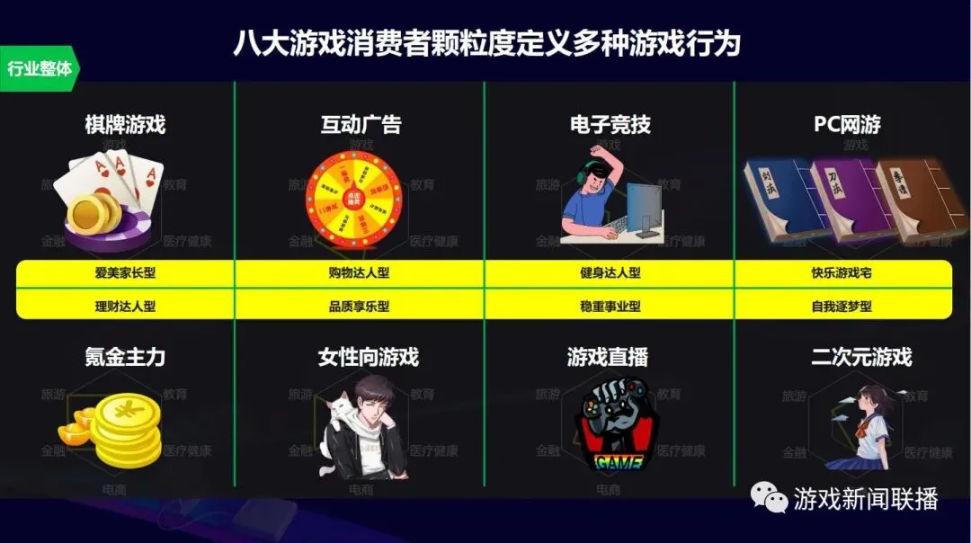 报告中通过爱美家长型、购物达人型、健身达人型、快乐游戏宅、理财达人型、品质享乐型、稳重事业型、自我逐梦型八大消费者颗粒度定义不同用户的游戏行为。并对页游、端游、手游用户群体提供了详细画像。