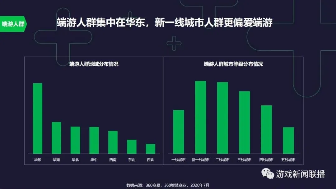 在用户群体上,页游和手游用户均以19-34岁、初高中学历的男性为主,并在地域分布上呈现由东向西递减、从沿海向内陆递减,且下沉市场潜力高;端游人群则集中在广东、浙江、江苏等发达地区,同时新一线城市人群更偏爱端游。